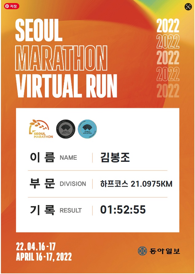 마라톤 풀코스는 42.1295km이고 하프 코스는 풀코스의 반인 21.0975km다. 4월 16~17일 버추얼 런으로 진행된 마라톤 대회에서 하프 코스를 가볍게 완주했다. 과천팀은 10km, 하프, 풀코스로 나누어 아침 6시 반부터 자체 대회를 진행했다. 우리는 아무런 준비도 하지 않고 개별적으로 달렸다.