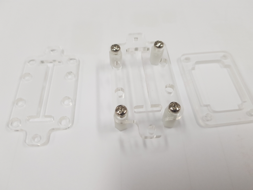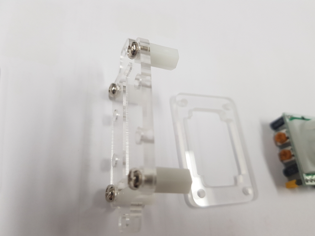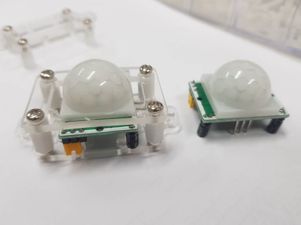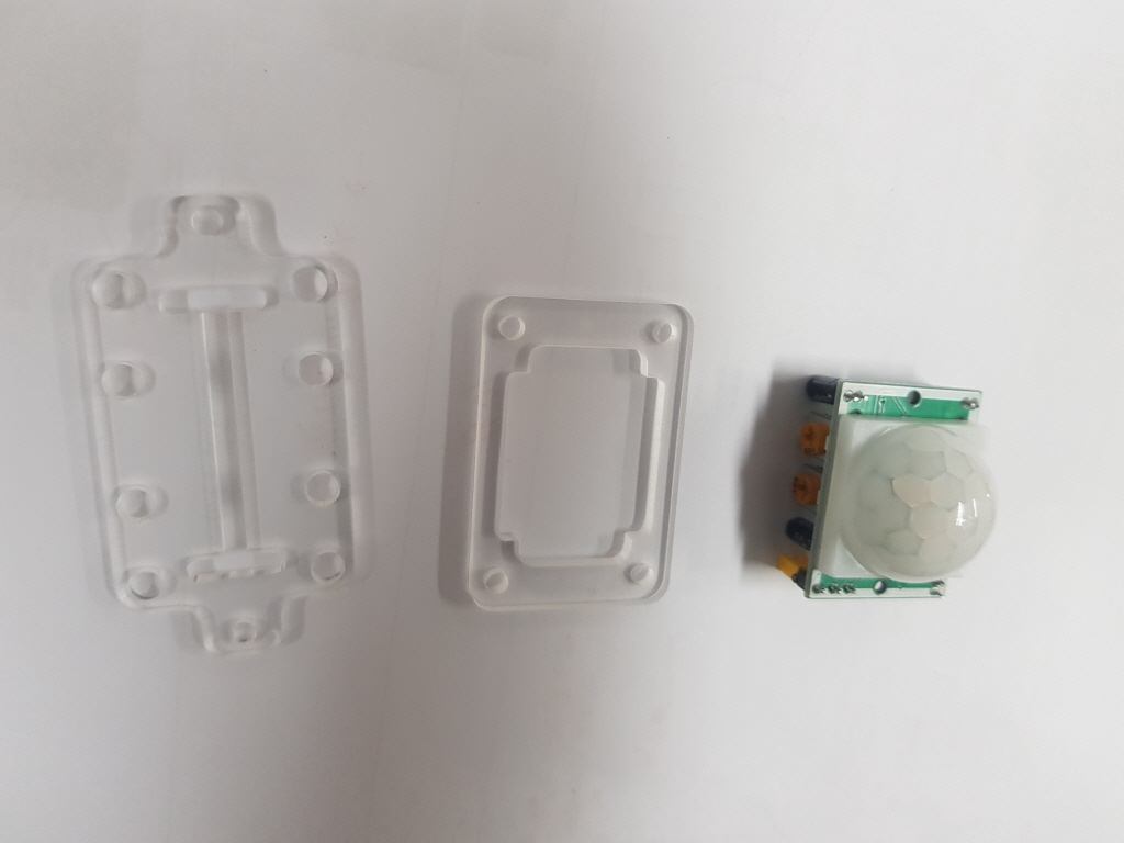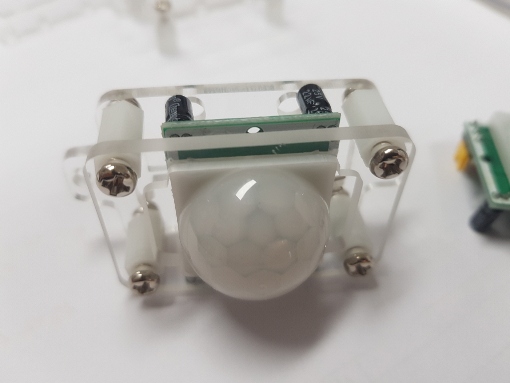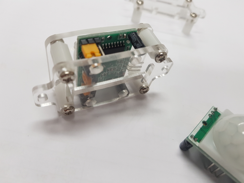 인체감지 센서는 특정한 곳에 부착하기가 어려운 편이다. 거의 정사각형 모양에다가 높이가 높아 정확히 고정하기가 어렵다. 아크릴을 사용하여 아래, 윗판을 센서 원형 덮개가 들어갈 만하게 구멍을 내고 서포터(고정대)와 나사를 사용해 고정하는 방법을 설명한다.