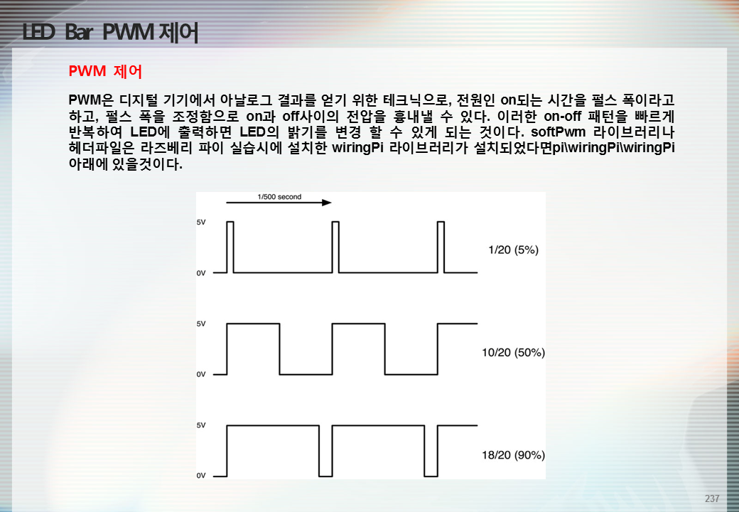 아래 코드는 PWM 방식으로 led bar를 제어하는 코드이다. thread를 사용하므로 컴파일할 때 반드시 thread 라이브러리를 추가해주어야 한다. pwm 제어 설명은 아래 이미지를 참고한다.