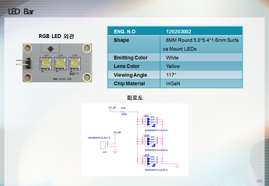 LED Bar는 직접 PCB를 제작하여 밝은 LED 3개를 병렬로 연결하여 전등 효과를 내기 위한 액츄에이터다. LED chip에 대한 기술적 스펙은 아래와 같다.