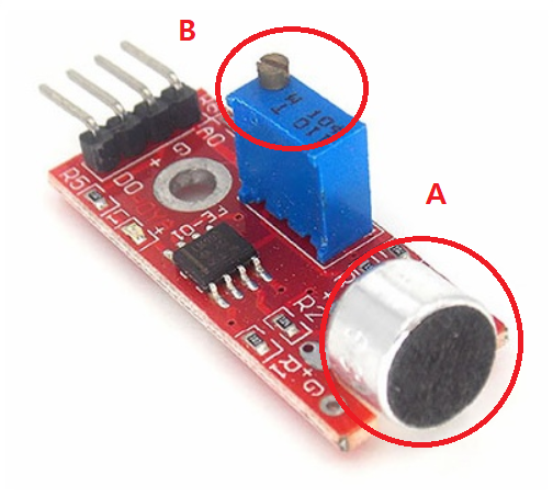 사운드 센서(Sound Sensor)는 센서 주변에서 발생되는 소리를 그림의 (a)부분 마이크로 모아, 소리의 크기를 증폭 시켜 출력합니다. 만약 원하는 대상의 소리가 잘 안들리시면 그림의 (b)부분이 가변저항으로서 가변저항을 통해 감도를 통해 조절 할 수 있습니다.