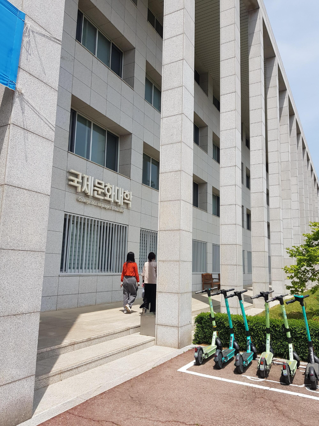 차디찬 푸른 5월이라서, 이렇게 좋은 날 놀지 않으면 죄책감이 들까 봐 국제 문화대학에서 여는 ERICA 콜로키움 강연을 들었다. ERICA 캠퍼스의 건축물을 한 마디로 말하자면 원기둥을 포함한 각기둥이다. 건물을 잘 몰라서 나열할 순 없지만 어디서든 줄지어 늘어선 네모 기둥이나 원 기둥을 볼 수 있다. 아주 멋진 건물인 국제문화대학, 본관 입구, 캠퍼스 가운데 분수 공원, 체육관 한쪽 예술대 건물은 네모 기둥이 뚜렷하게 보이고 다른 곳은 많지는 않아도 몇 개씩은 꼭 건물을 떠받치고 있다.