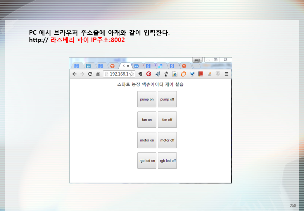 라즈베리파이 IP 주소:8002 를 입력하면 아래 그림과 같이 인텍스 파일이 만들어 준 버튼이 나타난다. 버튼을 누르면 보드의 액츄에이터가 잘 동작함을 확인할 수 있다. 이렇게 PC 브라우저에서 되면 스마트 폰에서도 마찬가지로 브라우저를 열어 제어할 수 있다. 아주 환상적인 기능 아닌가?