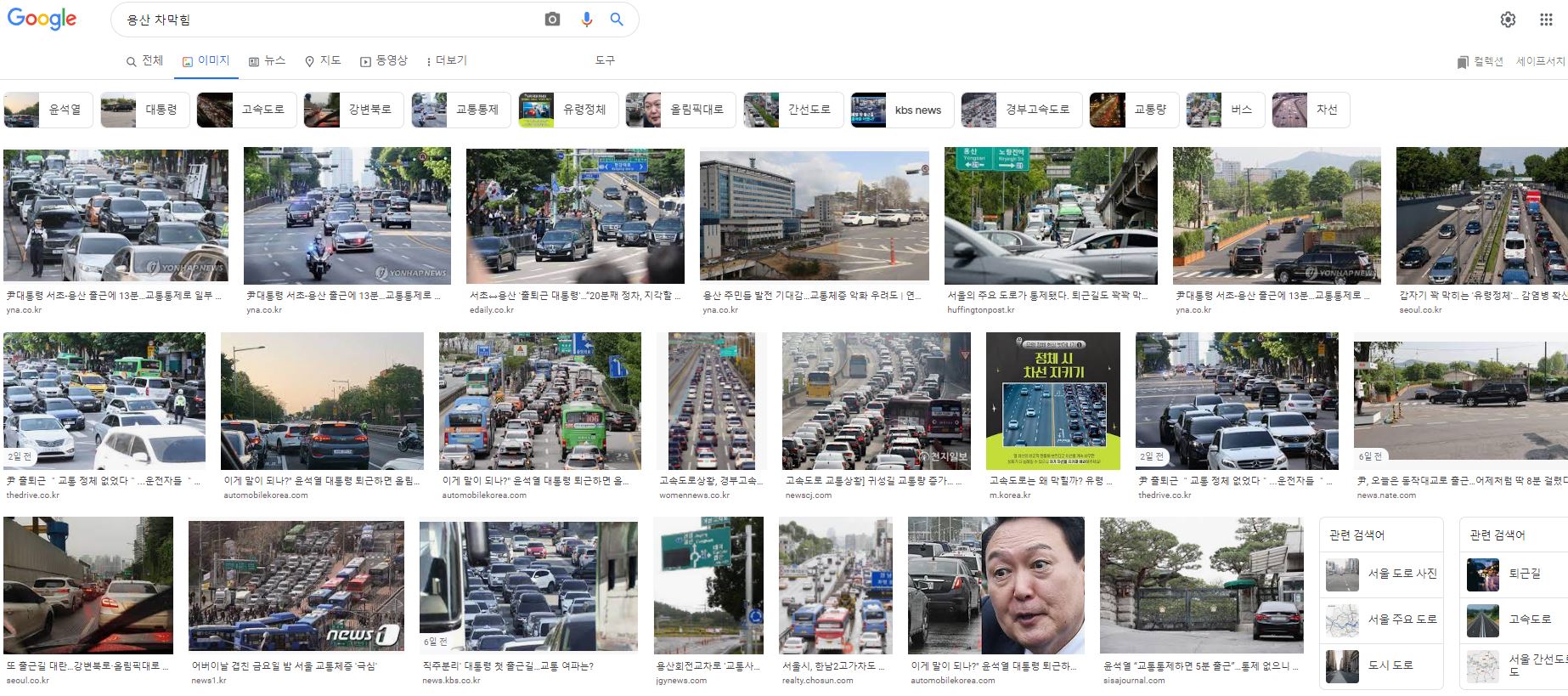 아래 이미지는 '용산 차막힘'으로 검색을 한 결과 화면이다. 다음과 네이버 구글의 이미지 검색은 이처럼 다르다. 이런 상황이 한 두번이 아니다. 우리나라에서 포털을 운영하는 일도 참 애잔하다.