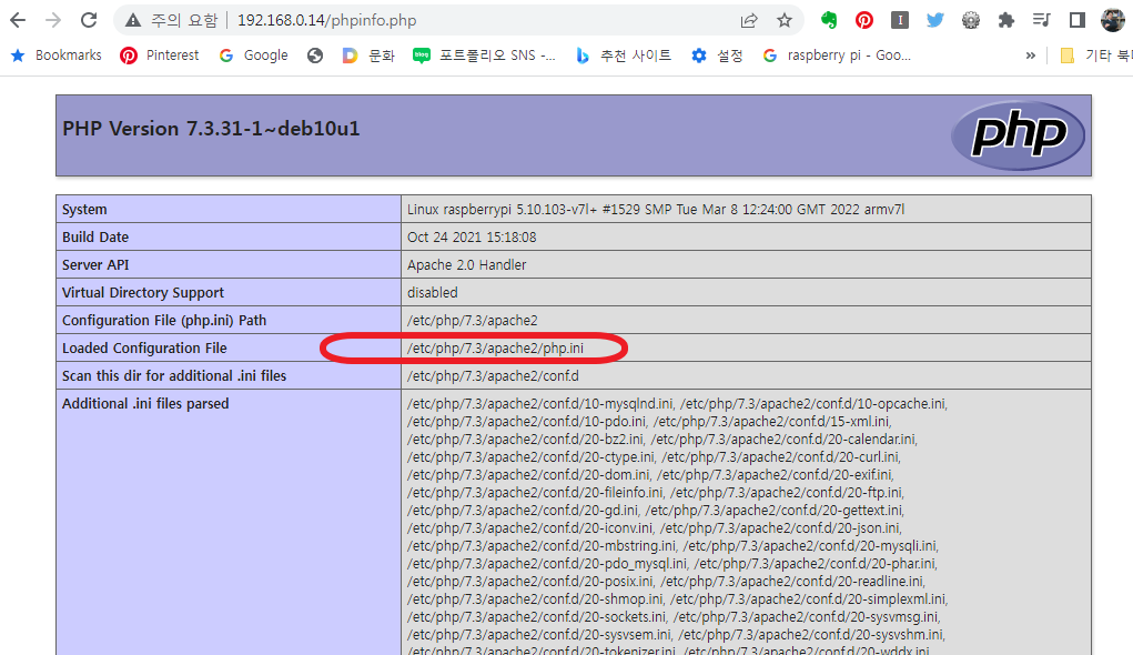 위 파일을 크로 브라우저에서 실행을 시킨다. 주소줄에 192.168.0.14/phpinfo.php 로 부르면 아래와 같은 화면이 뜨면 설치 위치를 찾을 수가 있다.