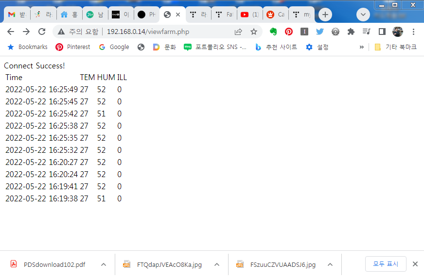 다음으로 웹에서 데이터베이스를 읽어 뿌려주는 php 파일을 viewfarm.php 파일로 만들어 준다. 코드가 잘 정리되지 않았지만 라즈베리파이 변경 구문을 모두 적용하여 잘 돌아간다.