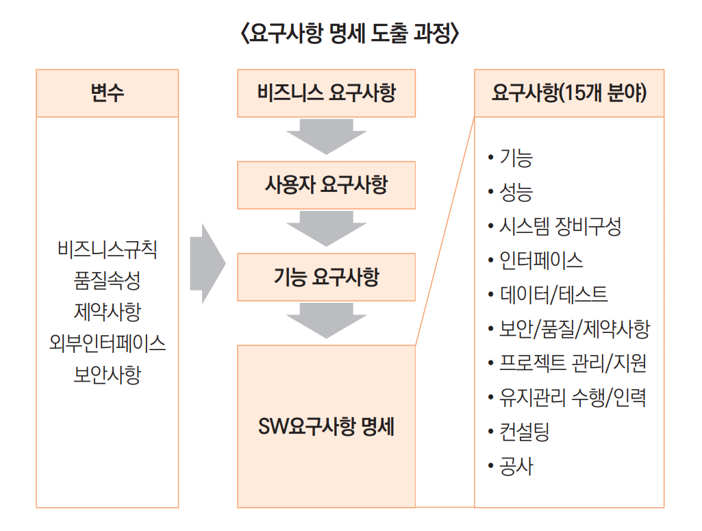 소프트웨어 요구사항은 비즈니스 요구사항을 토대로 관련 이해관계자 및 사용자 요구사항, 기능 요구사항을 거쳐 품질 속성, 비즈니스 규칙, 제약사항, 외부 인터페이스, 보안사항의 변수를 고려하고, 요구사항 상세화 절차는 추진사업의 이해, 현황 분석, 요구사항 도출, 요구사항 검토 및 확정 절차 순으로 진행됩니다.