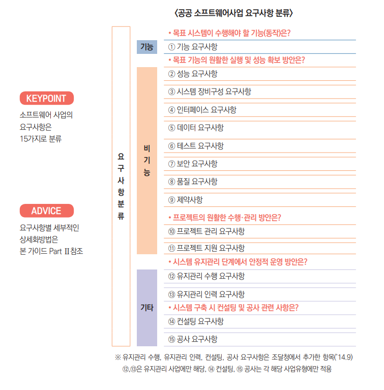 기능 요구사항에는 반드시 구현되어야 할 기능과 업무 및 사용자 편의성을 고려한 추가 기능 외 기능 커스터마이징 요구사항이 모두 포함됩니다. 소프트웨어 개발사업은 사용자 요구사항에 따라 구축 방향성이나 기능이 달라질 수 있고, 개발 이전에 구체적인 목표 시스템(To-be System)을 정의하기 어렵기 때문에 요구사항을 명확하게 도출하는 것이 필요합니다.