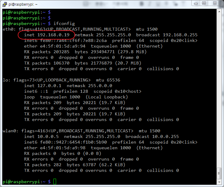 원격 접속을 위해 라즈베리파이 IP 주소가 필요합니다. 아래 그림을 보고 ifconfig 명령을 사용하여 IP 주소를 확인합니다.