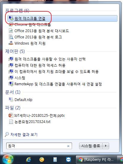 윈도에서 아래처럼 검색하여 원격 데스크톱 연결을 실행합니다.
