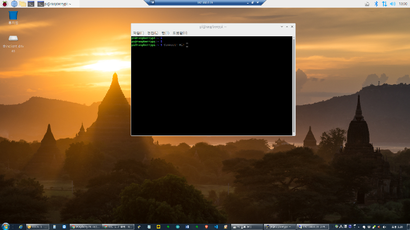 연결을 하면 윈도 화면에 아래와 같은 라즈베리파이 x-window 화면이 나오고 여기에서 라즈베리파이 터미널에서 사용하는 환경과 동일하게 사용하시면 됩니다. 고생하셨습니다. ^^