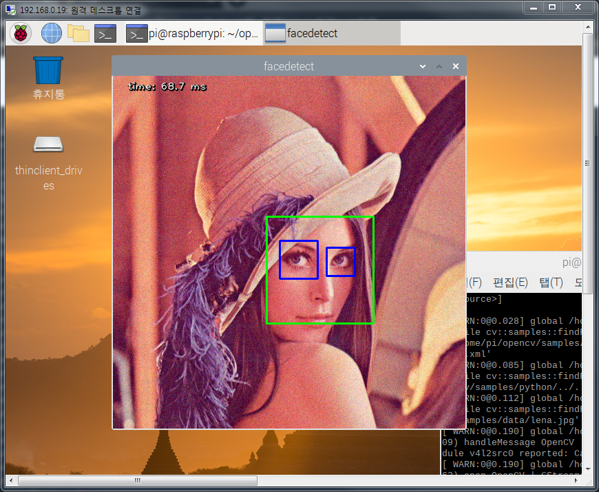 본 포스팅에서는 기본 예제 코드를 실행하여 정상 작동되는지를 확인해보겠습니다. 이미지 속 얼굴을 인식하여 얼굴과 눈을 표시해주는 기본 프로그램을 실행해보겠습니다. 기본 샘플 예제코드들은 /home/pi/opencv/samples/python 디렉토리에 있습니다.