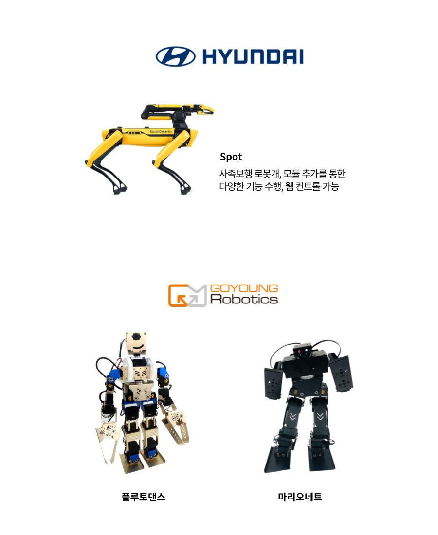 | Spot | 사족보행 로봇개, 모듈 추가를 통한 다양한 기능 수행, 웹 컨트롤 가능 |