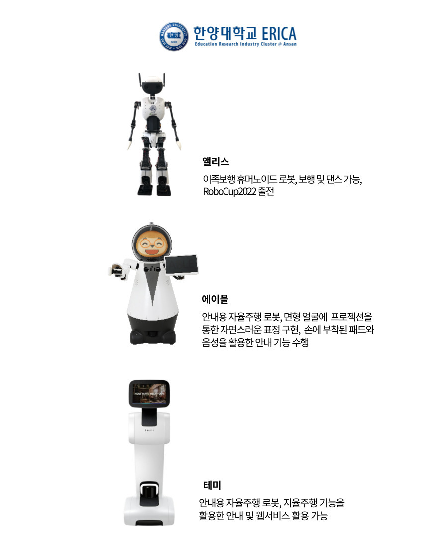 지능형 로봇 사업은 외부환경을 인식·인지하고 자율적으로 상황을 판단하여 인간을 위해 물리적으로 동작하는 시스템인 지능형 로봇 분야를 대상으로, 디지털 기반의 공유교육과정 및 공유학사제도를 통하여 지능형 로봇 사업단 지전을 실현하는 혁신 공유대학 사업입니다. - 한양대학교 ERICA 지능형 로봇 혁신공우대학 사업단