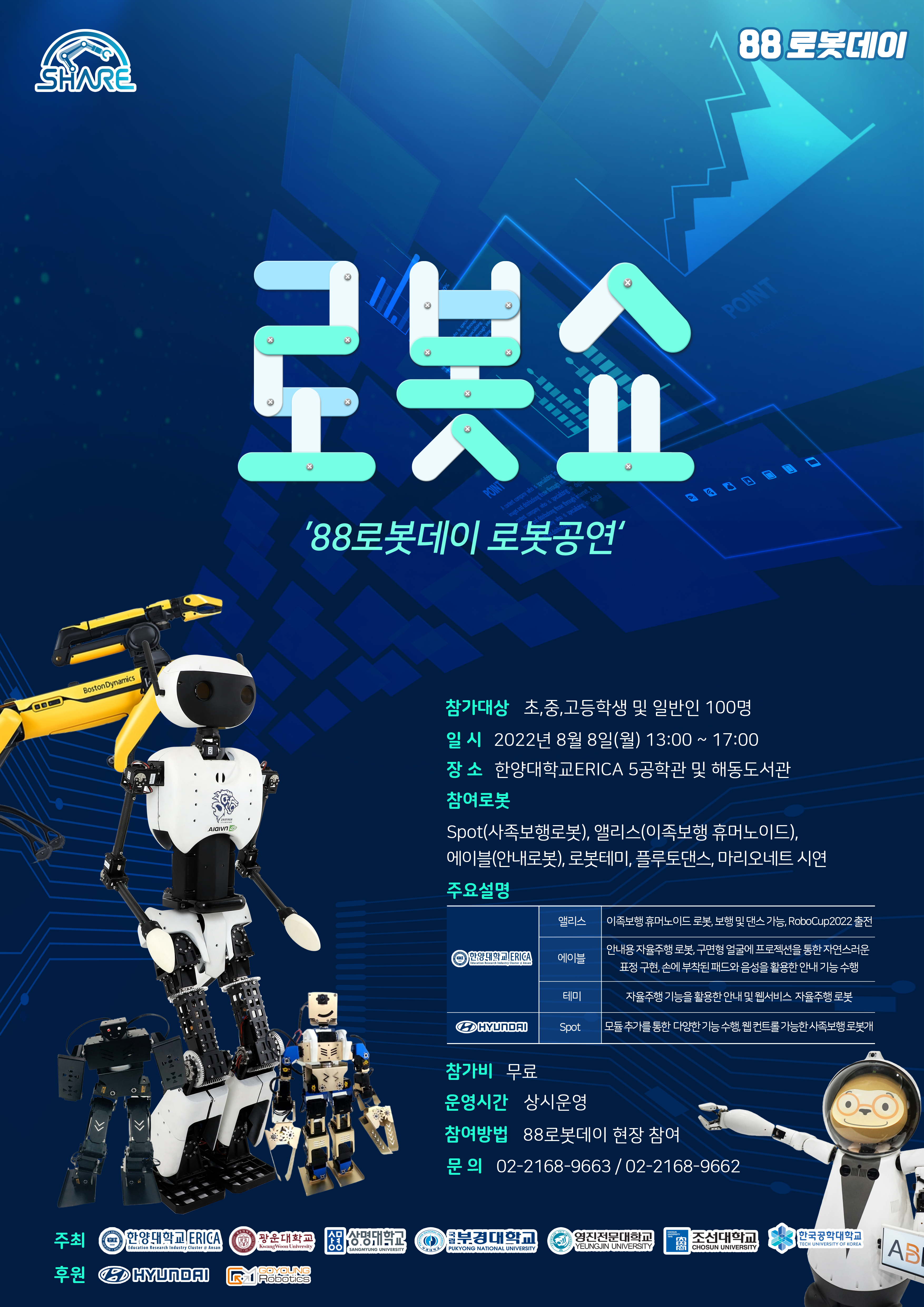 한양대학교 ERICA 지능형 로봇 혁신 공유대학 사업단(SHared AI-Robotics Education School)에서 주최하는 행사로 로봇에 대한 일반의 이해를 높이고 로봇을 체험하고 직접 만들어 보는 행사를 진행합니다.