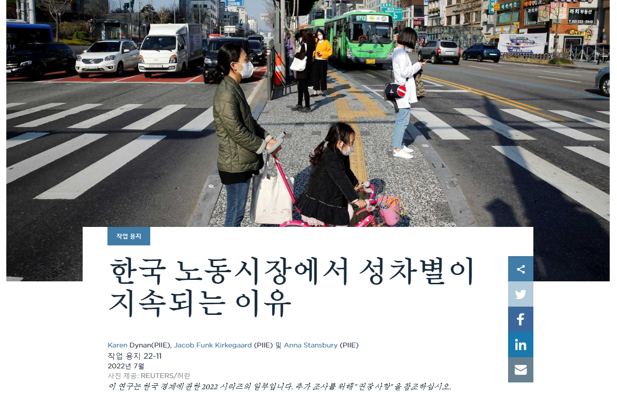 피터슨 국제경제연구소(PIIE) 워킹 페이퍼“젠더 격차의 원인과 영향을 이해하는 것이 한국의 단기뿐 아니라 장기 경제 전망의 핵심(central)이다”라고 시작합니다. 총 42쪽으로 구성된 보고서 다운로드