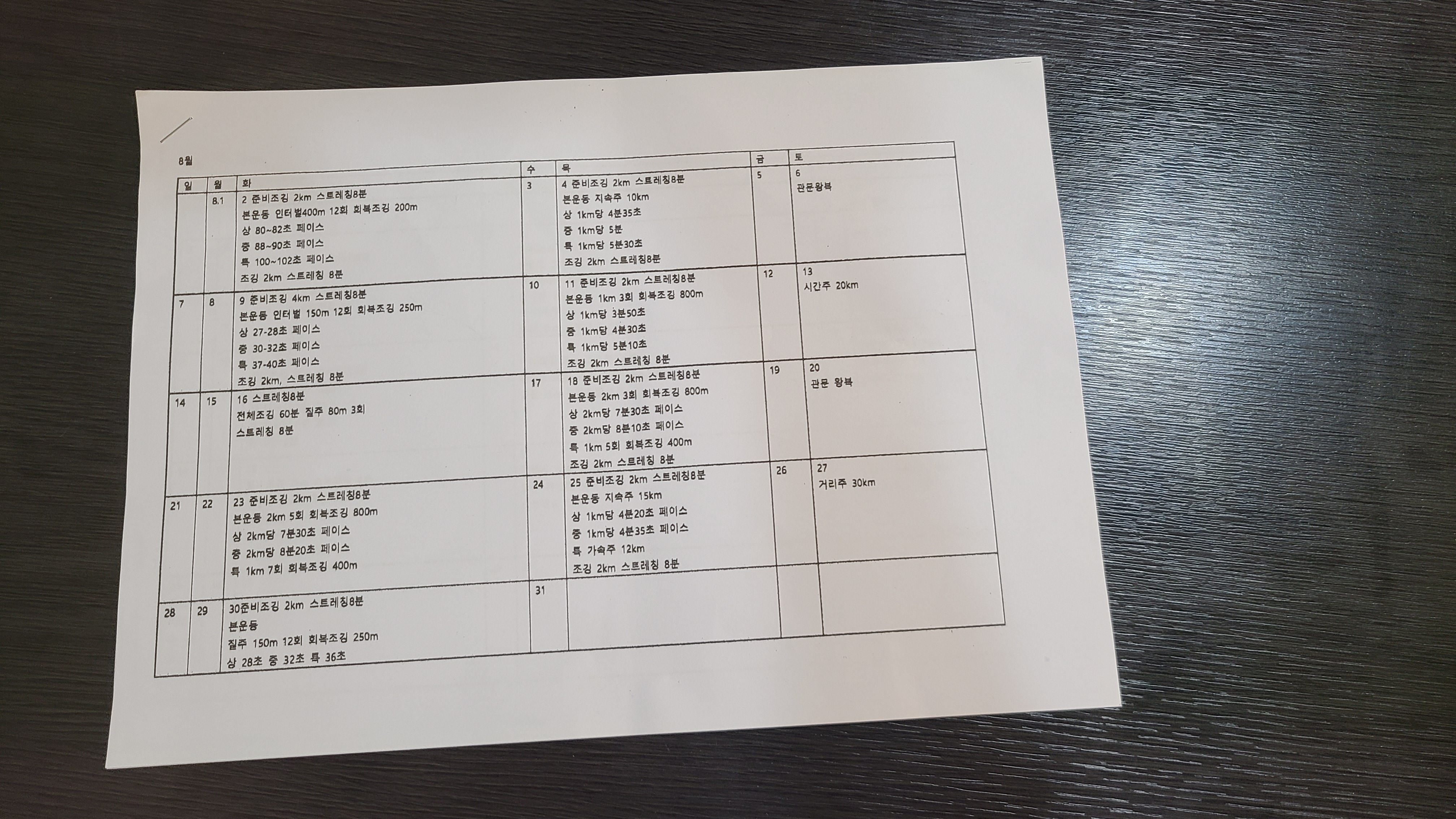 7월 장마와 무더위를 조금은 피해서 8월부터 훈련을 시작한다. 감독님은 어느새 8월~10월 훈련 일정을 회원들 개별 수준에 맞는 내용으로 촘촘하고 빈틈없이 짜 놓았다. 아래 훈련 내용을 사진을 찍어 보낸 것을 구글 드라이브 문서도구를 이용해 텍스트 파일로 변환해 올리기로 한다. 많은 대회를 준비하는 훈련 과정, 마라톤 풀코스 42.195km, 하프코스 21.0975km, 10km 등 어떤 거리를 조금도 걷지 않고 완주하기 위한 빈틈없는 훈련 일정은 목표를 달성하기 위해 꼭 필요하다.