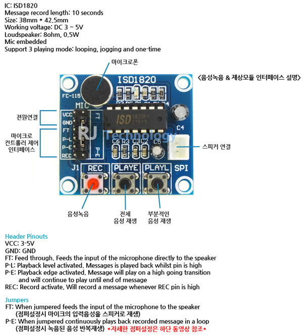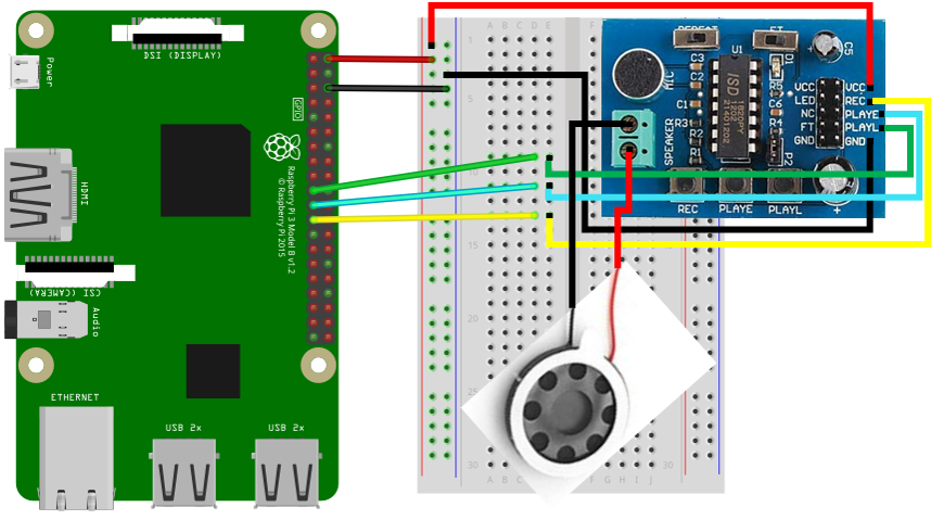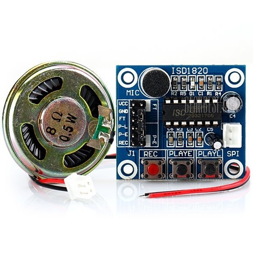 라즈베리파이 GPIO를 이용하여 음성 녹음 및 재생하는 장치를 제어해보도록 한다. 여기서는 음성 녹음(Voice Record) 모듈은 마이크를 통하여 음성을 녹음하고 스피커를 통하여 녹음된 음성을 재생한다. 여기서 사용된 모듈은 다중 메시지를 녹음/재생하는 디바이스인 ISD1820 칩을 사용한다. 이 모듈은 단일 칩 음성 녹음 및 비휘발성 데이터 저장, 그리고 8~20초 동안 재생 기능을 제공한다. 3.3V 전원에서 동작하며, 범위를 초과하면 모듈이 손상될 수 있다.