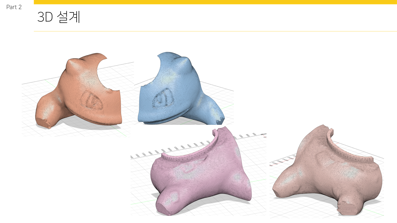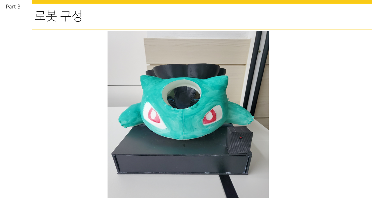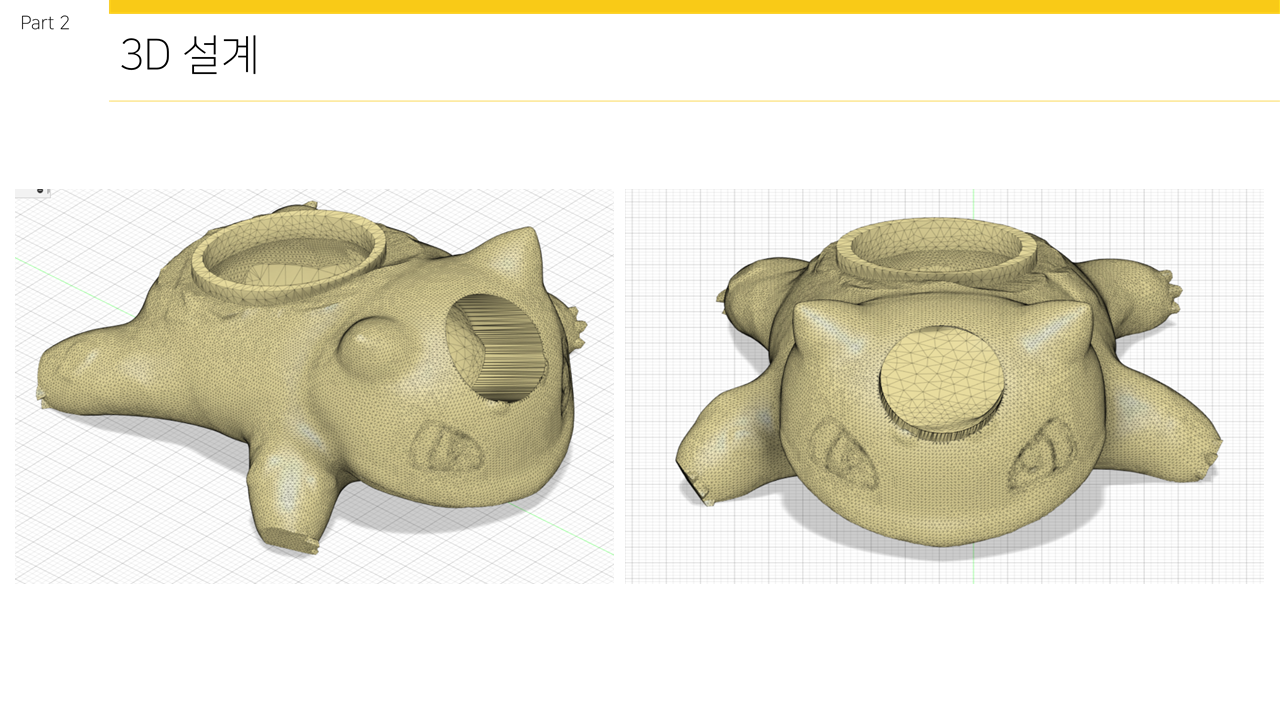전체 3D설계도는 위와 같으며 이상해씨 본래의 형태를 유지하되 공을 발사시켜야하므로 머리에 공 크기에 맞는 구멍을 뚫어주었다. 이상해씨 등 많은 포켓몬형태의 3D파일 기본 틀은 https://www.stlfinder.com/ 에서 찾을 수 있다. 이후 용도에 맞게 FUSION360에서 변형시킬 수 있다. STL파일을 컴퓨터에 저장 후 FUSION360 에서 Ctrl+O 를 누른 후 ‘내 컴퓨터에서 열기’ 를 눌러 파일을 찾은 후 불러 올 수 있다. 이번 로봇 제작 과정에서는 하드웨어 부분이 3D프린터에 비해 너무 커 4등분을 해 4번 제작 후 합쳤다.