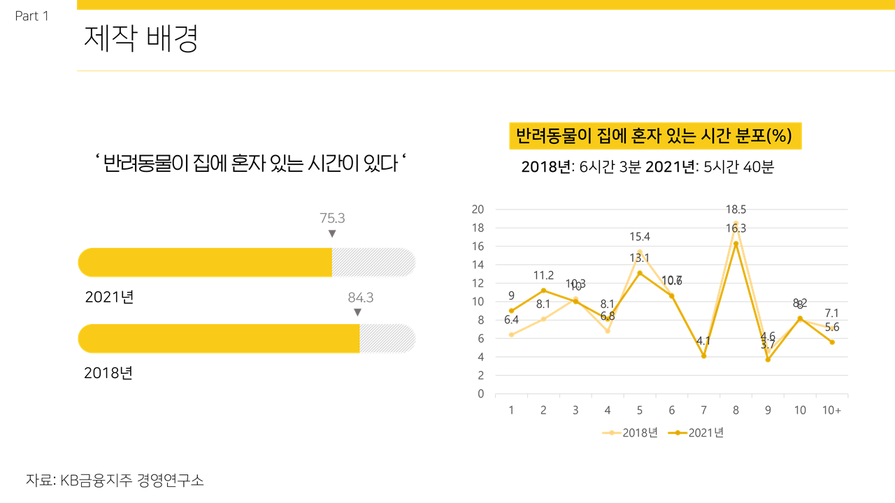 이 두 상황이 겹치면서 1인가구에서 키우는 반려동물 또한 같이 증가하는 추세이다. 이의 부작용으로 반려동물이 혼자 있는 시간이 점점 늘어나고 있다. KB금융지주 경영연구소가 발표한 ‘2021 한국 반려동물보고서’에 따르면 반려가구의 75.3%는 반려동물을 집에 혼자 남겨두는 경우가 있다고 응답했고 반려견 가구 중 반려견이 집에 혼자 있는 시간의 평균은 5시간22분으로 나타났다. 독립적 성향이 강하지않은 반려견의 경우 집에 혼자 있는 시간이 길어질수록 반려견의 분리불안 증세가 나타나게 된다. 이는 반려견의 건강에도 좋지않고 반려견의 주인이 집을 비우기도 심적으로 점점 어려워지는 결과를 낳는다.