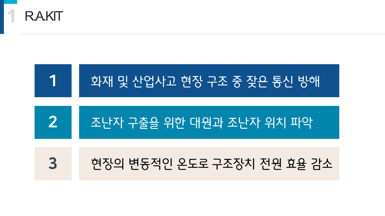 최근 건물 붕괴 사고, 산불 발생 등 다양한 재난 사고들이 발생하고 있다. 하지만 해당 현장을 수습하는 구급대원들을 지원할 수 있는 장치들이 매우 미흡한 상황이다.