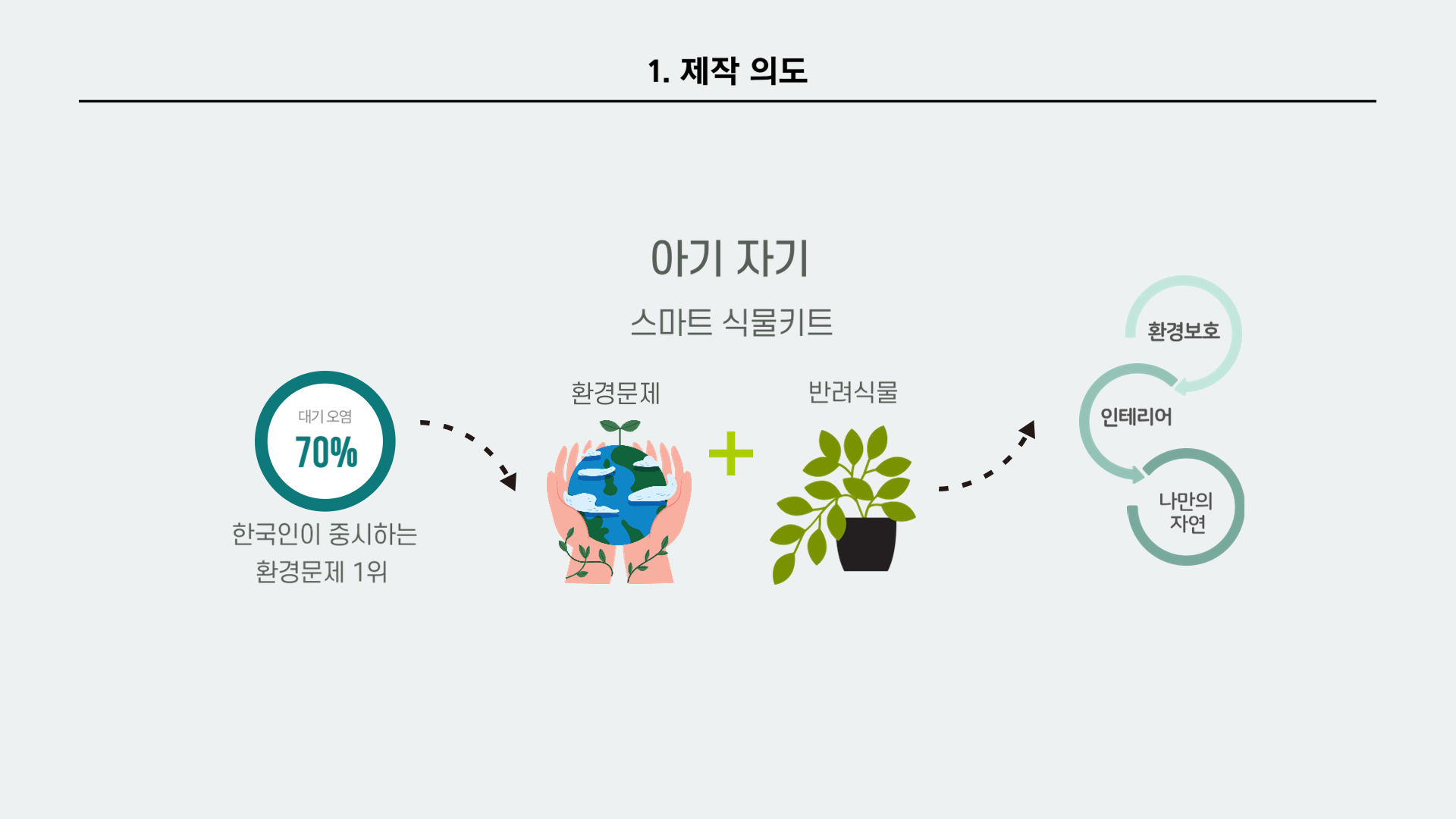 마지막으로 우리가 이 식물 키트를 만들어 많은 사용자가 사용한다면 사용자들이 식물에 대한 관심을 많이 가지게 될 것이고, 이것이 곧 사람들이 가지고 있는 환경보호에 대한 인식을 긍정적인 방향으로 조금씩 변화시키도록 하는 것이 궁극적인 이유이다.