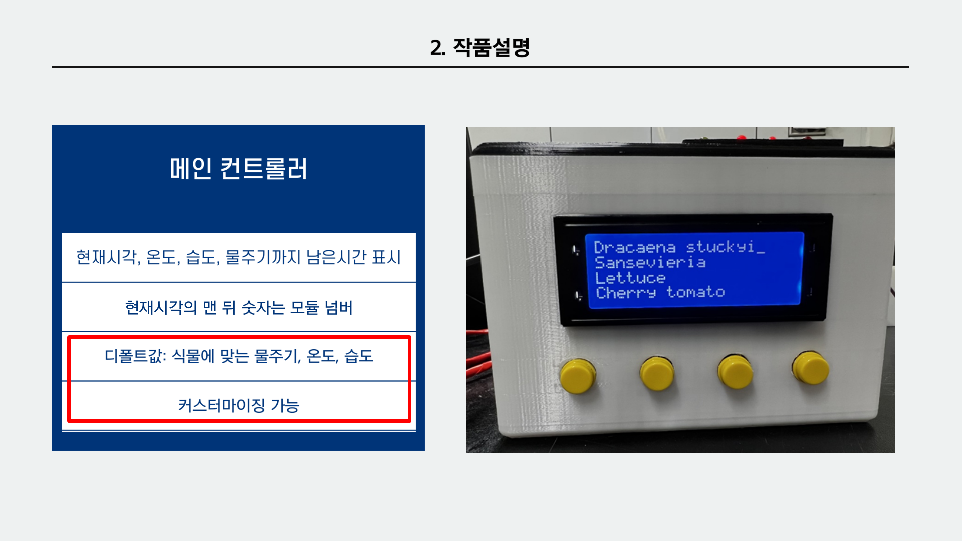 식물 키트를 만들고 나서 어떻게 만들지 구상하였다. 보통 식물을 기르는 가정은 하나의 식물만 기르지 않는다. 보통 3~4개정도를 기르고 많이 기르는 가정은 10개 이상도 기른다. 그래서 우리는 보통 가정에서의 평균인 3개 정도를 기준으로 잡았다. 관리해야 하는 화분이 3개이므로 중간 모듈을 만들기로 하였다. 만약 하나의 기계에 하나의 화분만 관리가 가능하다면 이는 사용자 입장에서 매우 불편하기 때문이다. 그래서 우리는 하나의 메인 기계가 있고 화분 개수에 맞는 3개의 모듈을 구상하기로 하였다. 또한 메인 기계에 식물 데이터를 5개 정도 넣어두었다.