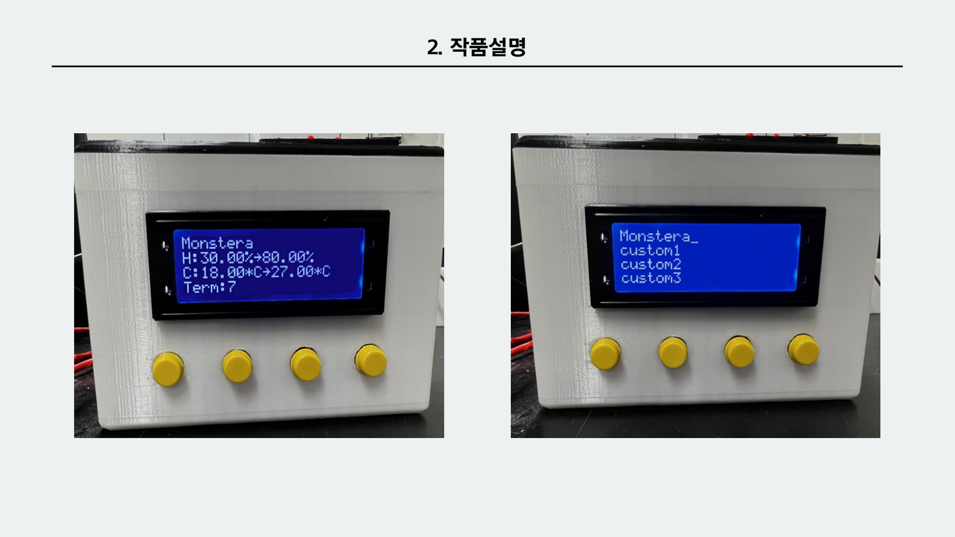 더 나아가 각각의 식물의 종류에 따라 다른 관리 방법을 부여할 수 있다면 관리가 어려워 기르기에 부담이 있었던 식물들도 부담 없이 기를 수 있을 거라 생각했다. 그래서 최종적으로 우리는 각각의 식물의 적정온도, 적정습도, 물 주는 주기 같은 데이터가 내장되어 있고 그 값에 맞는 관리방법으로 식물을 관리해주는 스마트 식물 키트를 만들기로 하였다.