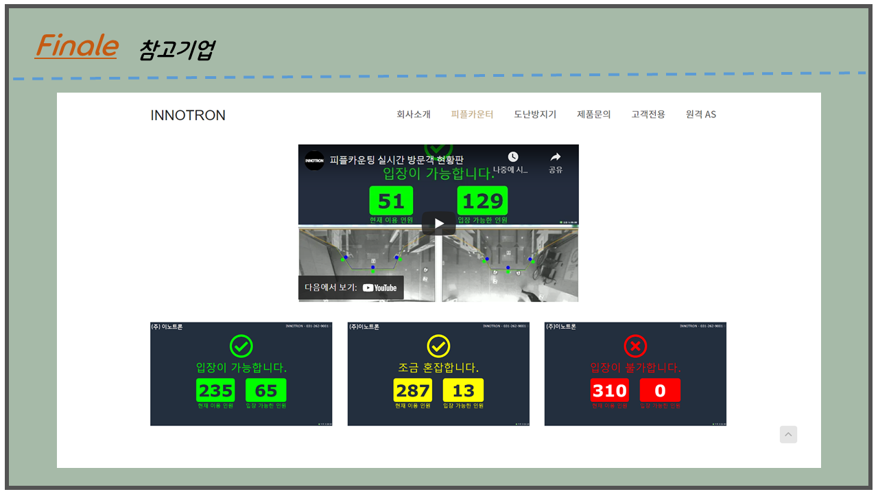 “이노트론”이라는 기업은 3D인식 카메라 기반으로 건물내 유동인구 수를 측정하여 백화점, 아울렛 매장, 가게 등등 솔루션을 제공하는 업체이다. 9조 간담상조는 해당기업을 모티브하여 인체 감지 센서를 이용하여 사람 수를 카운트하는 작품을 개발하게 되었습니다.