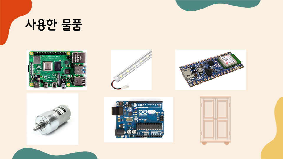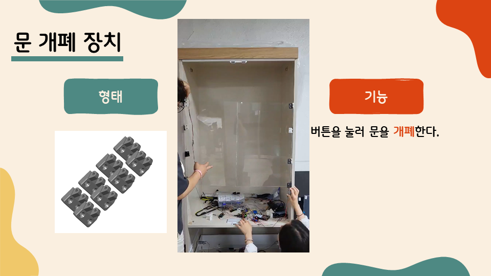옷장의 아래 서랍을 여는 데에는 DC모터와 아크릴로 제작한 바퀴, 3D 프린터로 뽑은 레일을 사용하였는데 어려운 점이 있었습니다. DC 모터의 출력이 예상보다 훨씬 커서 3T로 제작한 아크릴이 그 힘을 견디지 못하고 부서지는 경우가 발생하였습니다. 그래서 5T짜리 아크릴로 바퀴를 추가 제작하여 3T짜리와 합쳐 바퀴를 더 두껍게 제작하여 이 문제를 해결하였습니다. 바퀴가 두껍고 더 튼튼해졌음에도 불구하고 서랍 문이 잘 열리지 않아 마찰력 증대 테이프를 레일에 적당량 붙여서 이 문제를 해결하였습니다. 일련의 과정을 거치면서 수업 시간에 배운 물리학적 지식을 적절하게 이용하지 않으면 시행착오를 겪게 된다는 것을 새삼 느꼈습니다.