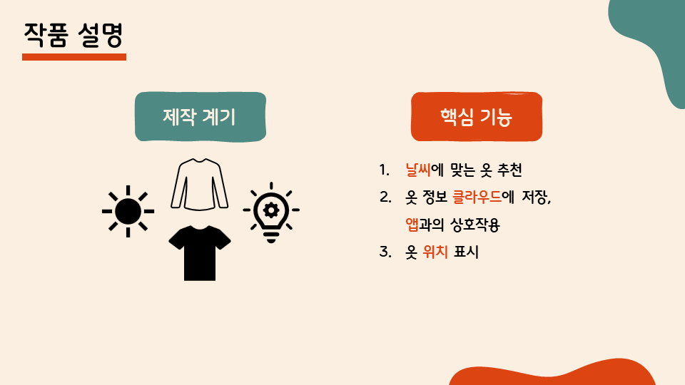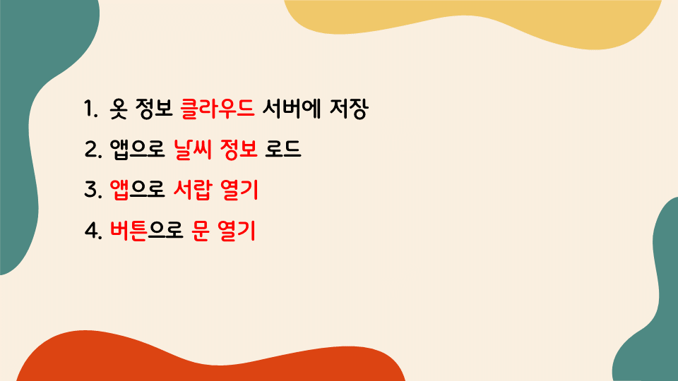 저희 팀은 이번 프로젝트에서 작품을 완성하지 못하더라도, ‘어드벤처 디자인’ 과목의 취지에 부합한다고 생각해서 어려운 주제를 선정하려고 노력했습니다. 통신에 관한 이해가 부족하지만 그래서 오히려 과정에서 많은 것을 배울 수 있을 것이라고 생각하여 클라우드를 이용하는 주제를 선정하기로 하였고 그렇게 클라우드에 정보를 저장, 전달하고, 알고리즘이 사용자에게 옷을 추천하고 위치를 알려주는 ‘스마트 옷장’을 주제로 선정하게 되었습니다.