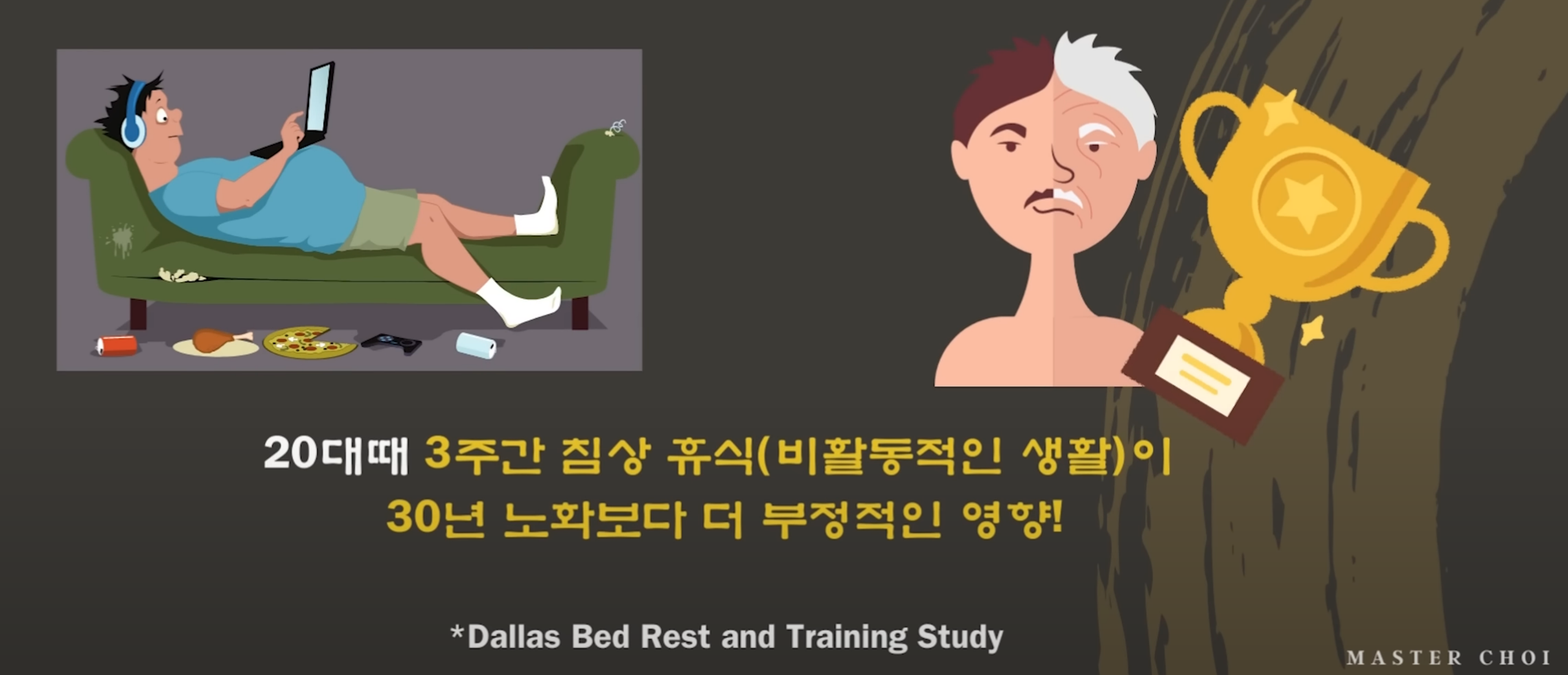 그런데 이것이 구체적으로 노화로 인해서 얼마나 떨어지는지는 우리가 데이터를 본 적이 없어요. 이것을 한번 보고 싶지 않으세요? 아주 재미있는 실험이 있어요. 무려 30년에 걸친 실험인데요. 이 첫 실험은 1966년에 시작됩니다. 3주간 침대에서 휴식하는 것과 8주간 훈련하면서 이 최대 산소 섭취량 변화를 관찰했어요. 그러고 나서 시간이 아주 오래 지나고 난 다음에, 30년이 지나고 나서 후속 연구를 다시 한번 진행합니다. 다시 최대 산소 섭취량을 측정을 했어요. 그런데 놀랍게도 30년 노화로 인해서 떨어진 최대 산소 섭취량보다 20대한테 3주간 침대에서 뒹굴거리라고 했을 때 최대 산소 섭취량이 더 많은 감소가 일어났습니다.
