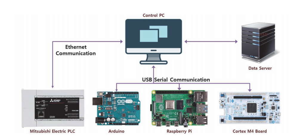 스마트 팩토리가 일반화되기 위해서는 엔지니어와 장비들간 네트워크 통신을 통하여 실시간으로 자동화된 공정을 진행함으로써 공장의 효율성을 극대화하고 구축된 IT 시 스템의 연계가 원활해야 한다. 특히, 이기종 설비에서 실시간 데이터를 수집하여 저장하고 방대한 양의 데이터를 분석하고 시각화하여 필요한 정보를 활용할 수 있어야 한다. 따라서 본 연구에서는 스마트 팩토리 도입 전에 자동화 시스템이 구축되어 있는 경우가 많으므로 인공지능(AI), 사물인터넷(IoT) 및 빅데이터(big data) 등의 연결을 통한 스마트 팩토리 구축을 위하여 범용으로 사용되고 있는 PLC (MELSEC iQ-F FX5), 아두이노(Arduino), 라즈베리파이 (Raspberry-Pi), 임베디드 시스템(Embedded System) 등 4종의 제어기를 구성하여 실시간으로 데이터를 수집 및 저장하여 정보를 관리할 수 있는 프로그램을 개발하고자 한다.