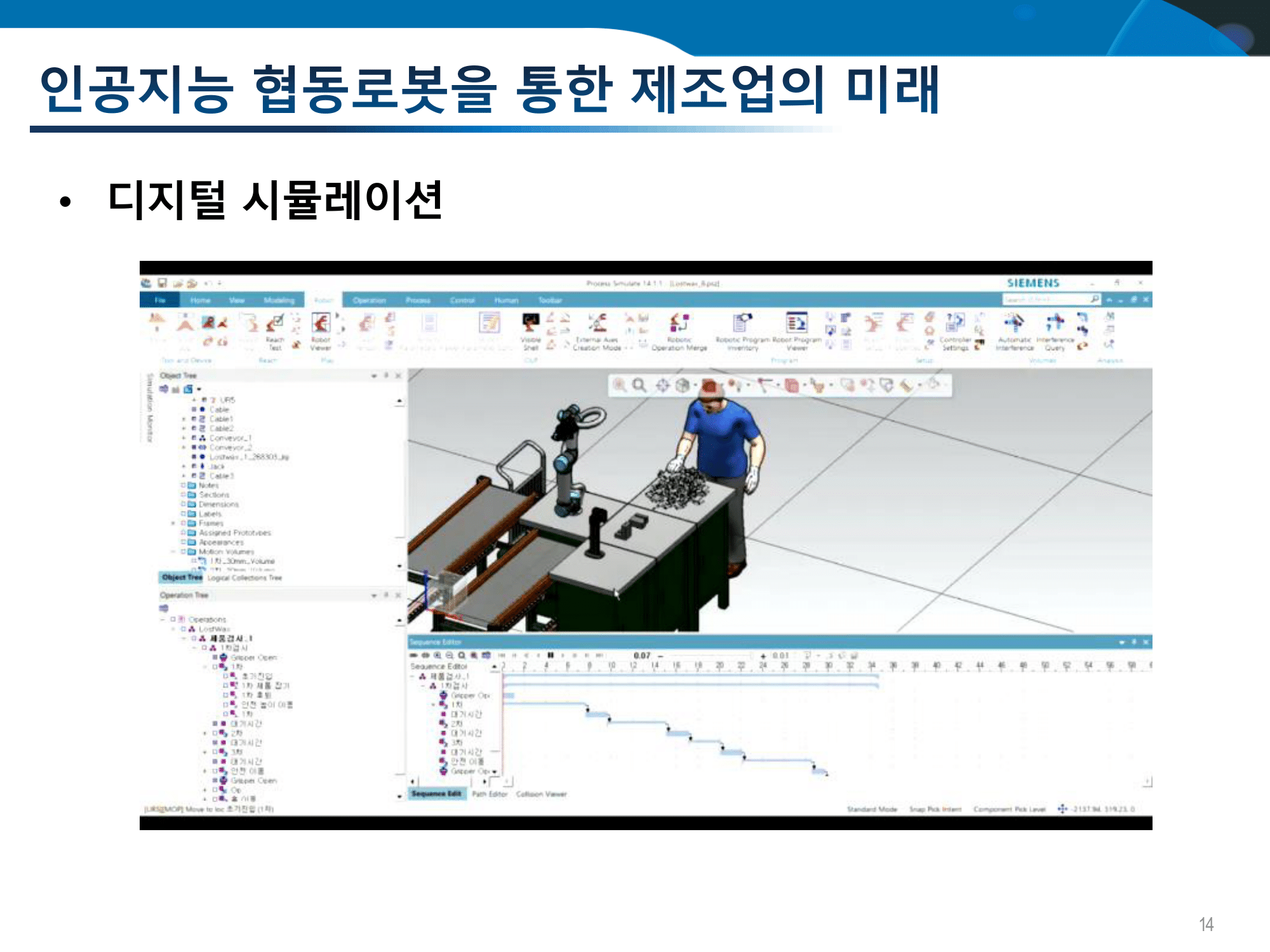3d로 한번 그려봐서 로봇은 어디에 넣고 적재함은 어디에 두고 이런 형태로 이렇게 환경을 모델링을 해봐서 이번에는 시뮬레이션을 해보는데요. 저런 환경에서 저는 이렇게 제품을 집어서 이송을 하면 중간에 보이는 부분이 까만 저 부분이 카메라인데요. 카메라에 제품을 비춰서 불량이 있는지 없는지 보는 이 과정들을 시뮬레이션해보는 거예요. 아래쪽에 보면 저기 타임 라인이 있는데 요 부분 이 부분이 뭐냐 하면 각각의 작업을 하는데 시간이 얼마나 걸리는지를 다 이렇게 재보는 겁니다. 그래서 뭐 불필요한 작업이 있는지 이런 부분들을 다 시뮬레이션을 해봐서 최적의 공정 시나리오를 만들어내는 거고요.