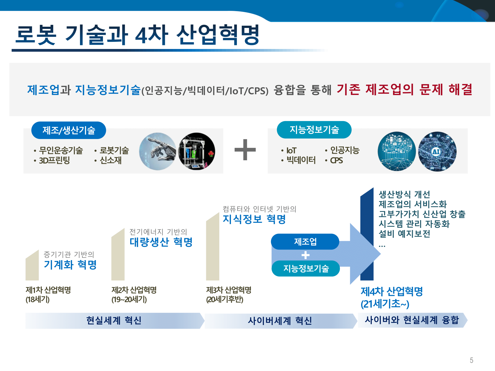 로봇 기술과 4차 산업혁명의 관계에 대해서 조금 더 설명을 드리면 4차 산업혁명이라는 말은 굉장히 많이 나오고 있습니다. 하지만 혹자들은 그런 이야기도 하는 것 같아요. 3차 산업혁명과 비교하여 많이 달라진 부분이 있느냐? 이미 3차 산업혁명에서 인터넷이나 다양한 네트워크와 같은 지능 정보 기술들이 많이 부각이 되었었는데 4차 산업혁명은 무엇이 나아졌는가?라는 질문이 아옵니다. 단순히 ICT 기술이 발전을 한 것만이 아니라 기존에 있었던 제조 기술 흔히 말하는 3d 프린팅 로봇 기술과 소재 기술들과 지능 정보 기술이 아주 밀결합을 하는 형태의 산업혁명이 일어난 것이다.라고 볼 수 있습니다. 그래서 단순히 새로운 어떤 지능정보 기술에 대한 서비스가 나타나는 게 아니라 기존의 기술들에 접목이 돼서 기존에는 불가능했었던 일들을 많이 해결을 하게 됩니다. 그래서 여기서는 제조업과 로봇 기술에 대한 이런 것들을 강조를 하고 있는데 요즘 제조업 분야에서 활발한 변화가 일어나고 있죠.