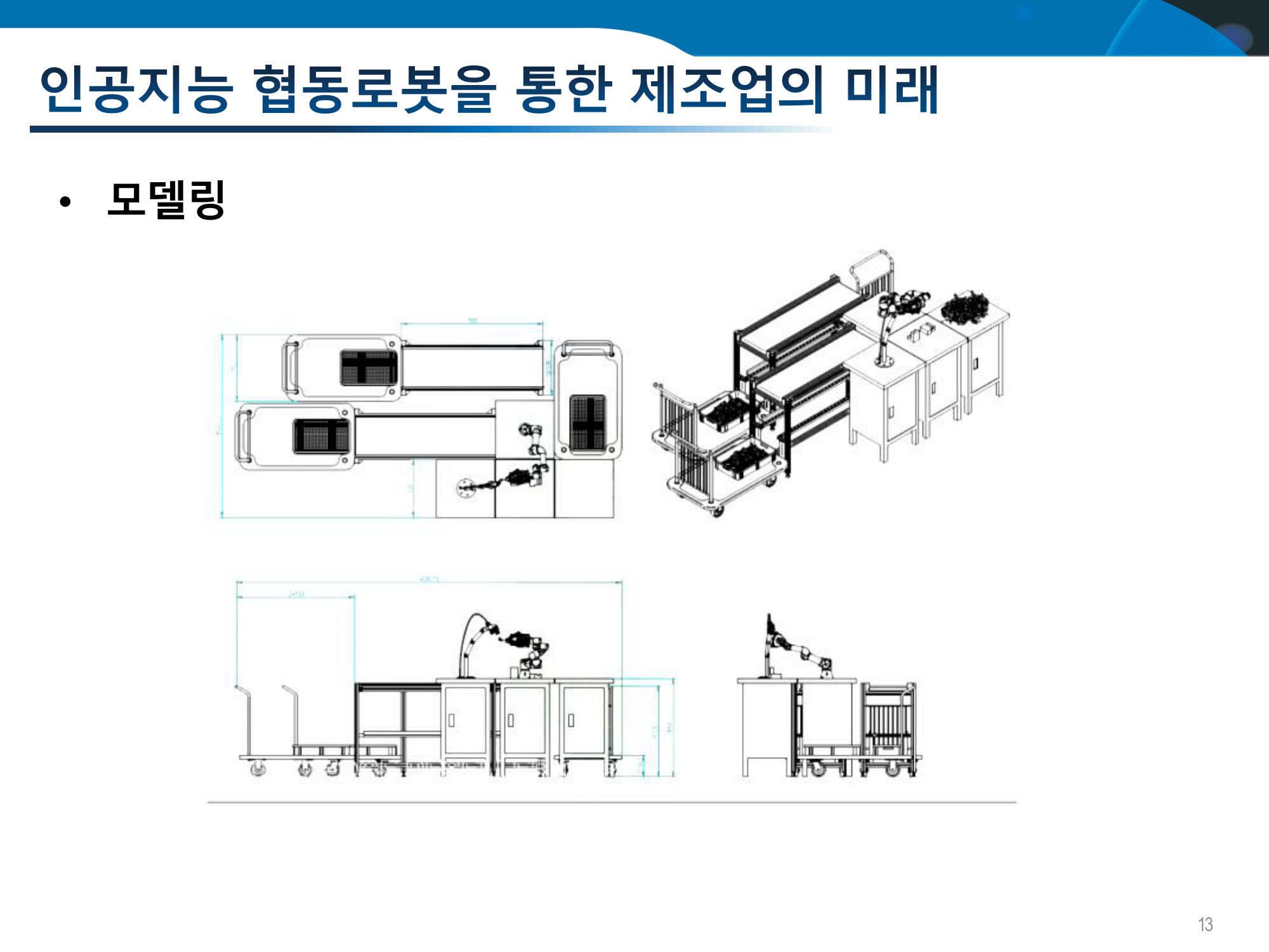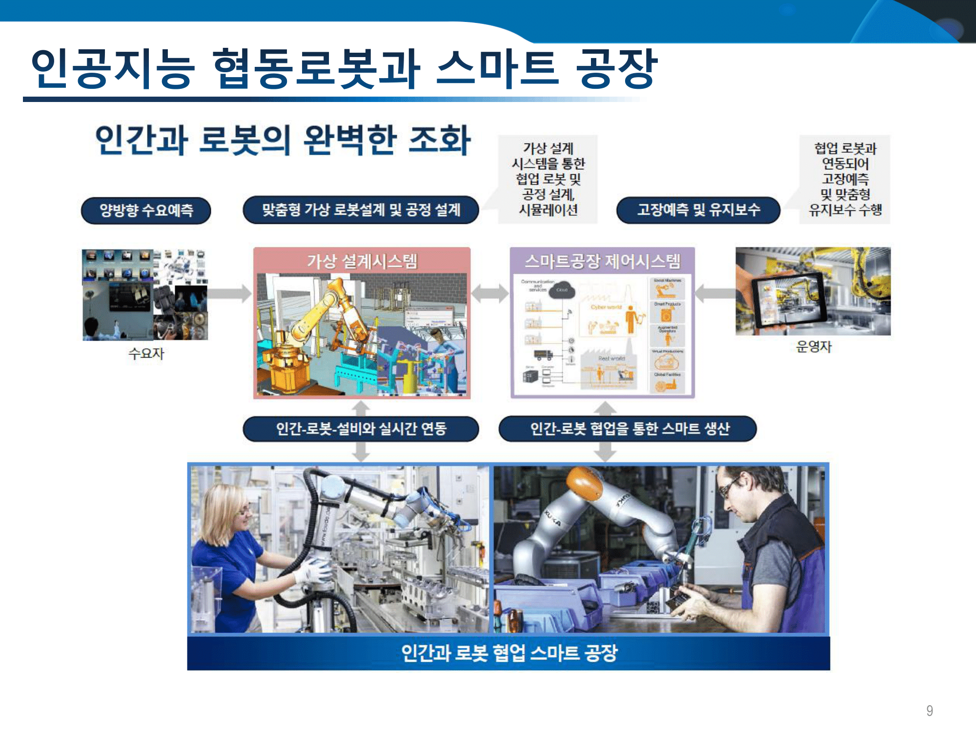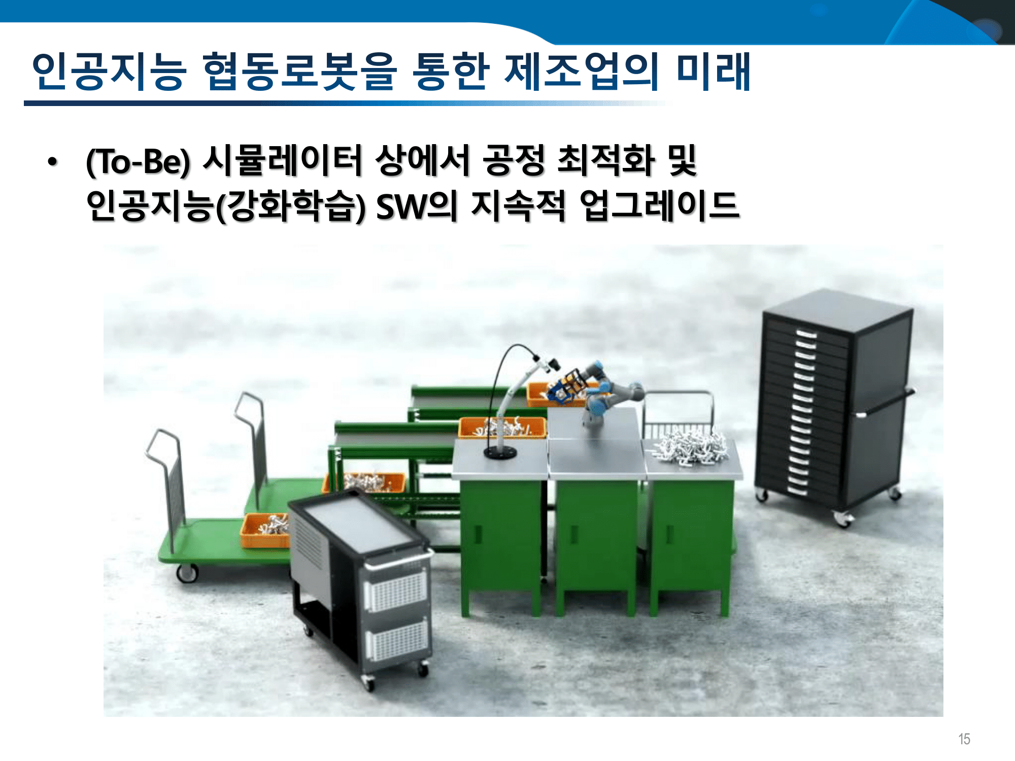 그래서 생산 부분에 적용을 하기 위해서 좀 중요성을 강조하기 위해서 제조업에 대해서 강조를 해놨지만 꼭 제조업뿐만이 아니라 다양한 사회 전반에 반영을 할 수 있는 게 로봇 기술입니다. 그래서 오른쪽 하단에 동영상을 보시면 독일에 있는 스마트 공장인데요. 작업자가 뭔가를 조립을 하고 있죠 그러면 여기 보시면 로봇 팔이 움직이면서 단순히 저 로봇 팔이 부품을 집어주는 게 아니라 다음 작업이 뭔지를 분석을 하고 있는 거예요. 그래서 현재 작업 상태를 보고 다음 작업이 뭐니까 그 부품에 대해서 집어서 사람들에게 사람에게 이렇게 넘겨주고 있습니다.