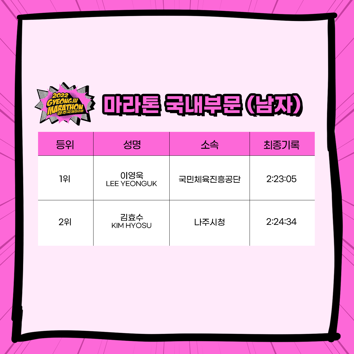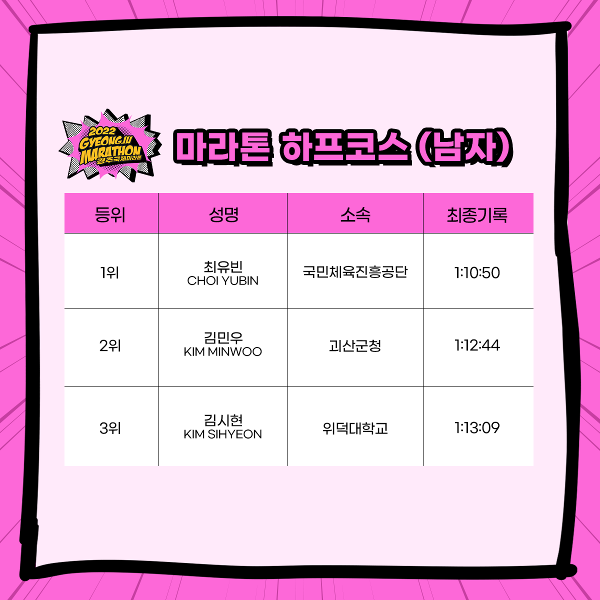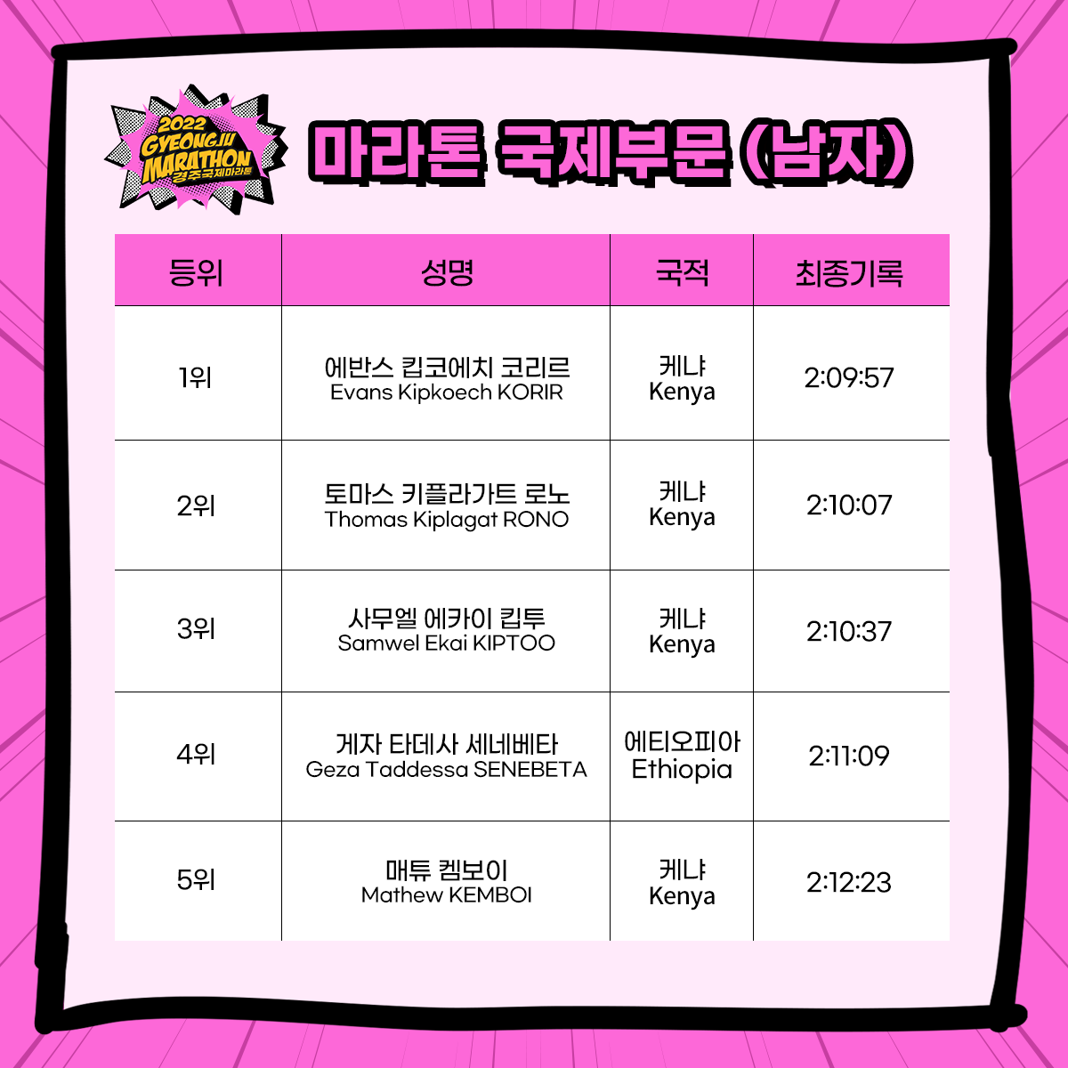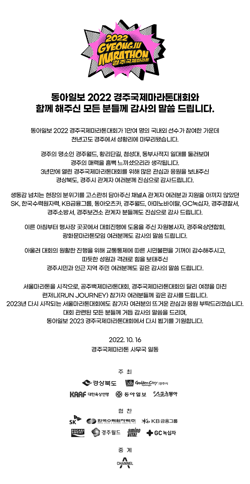 경주 국제 마라톤 가이드북을 참고로 올려둔다. 가이드북은 대회 진행에 관련된 모든 내용을 설명한다. 대회 일정과 요강, 유의사항, 마스터 부문 안내, 대회 코스 맵, 셔틀버스 운행 등 큰 대회를 참가하는 선수에게 꼭 필요한 정보들을 제공한다. 일단 문서를 올려둔다.