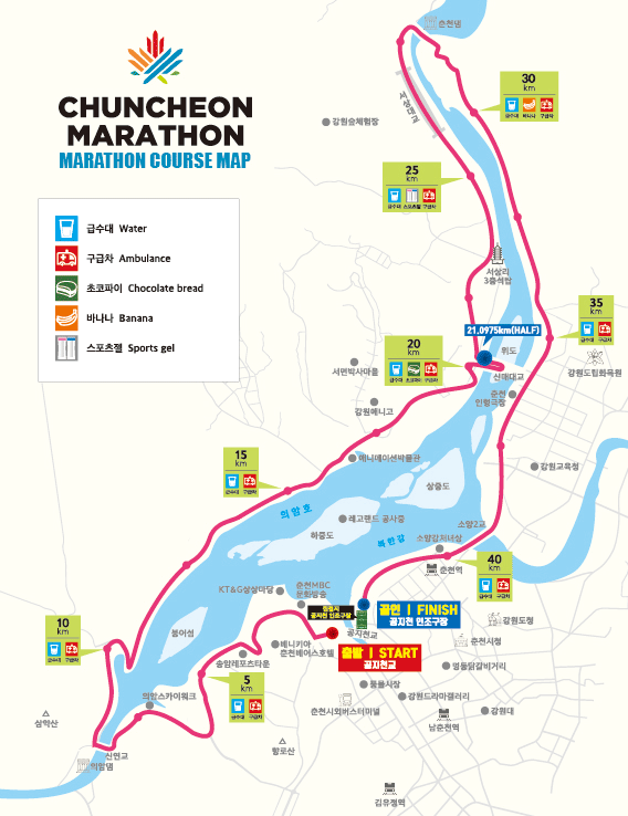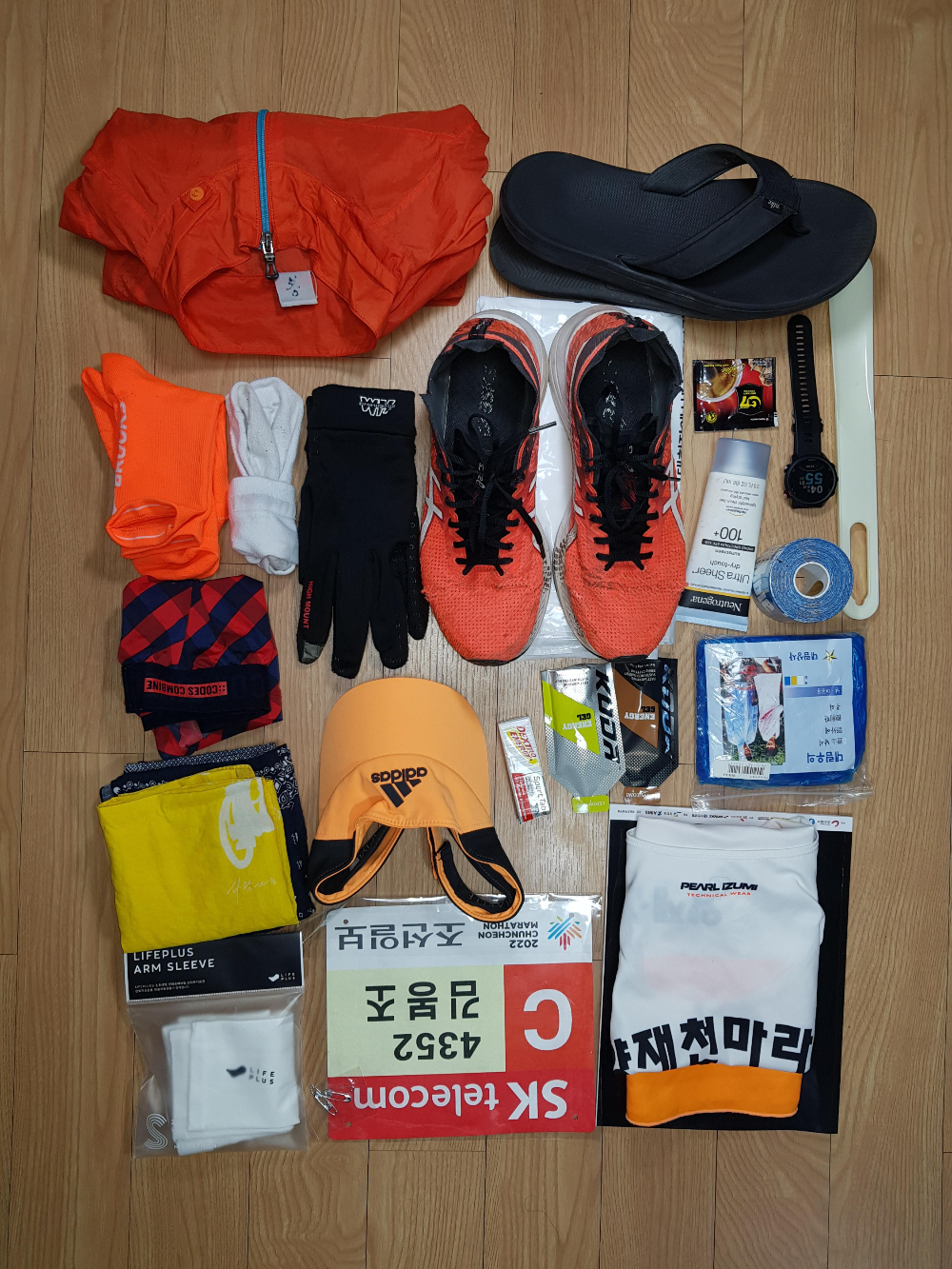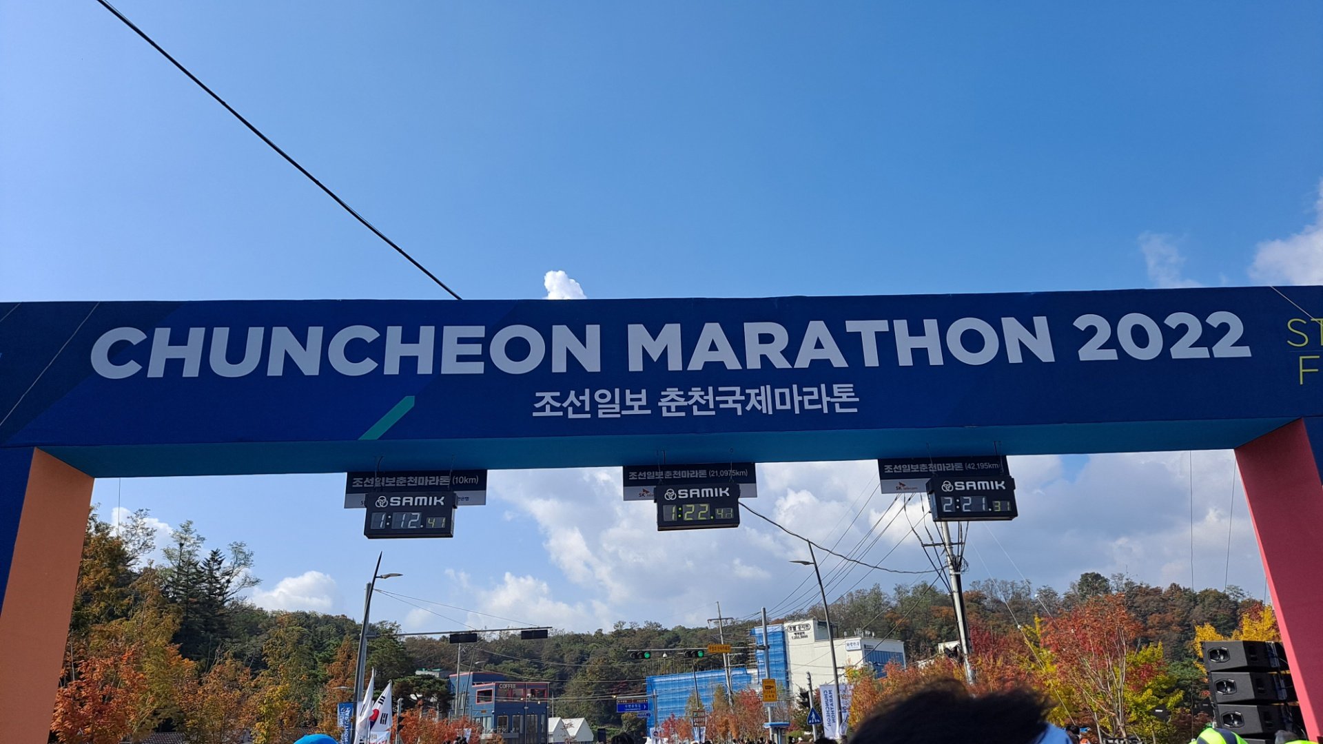 이번 대회에 동호회에서 29명이 참가한다. 아침 6시에 서초문화원에서 전세 버스를 타고 간다. 팬데믹으로 3년 만에 대회가 열리는 공지천 유원지는 소란스럽고 정신없고 혼잡하다. 전설이 시작하는 곳은 늘 이렇다. 유일하게 서울이 아닌 곳에서 열리는 메이저 대회라 러너들의 얼굴은 환하고 젊은 러너들이 많아 열기가 뜨겁다. 중년 정도인 러너들은 훈련 부족과 체력 저하, 혹은 두려움으로 덜 참가하고 러닝크루, 번개 달리기, 스포츠 의류 메이커가 후원하는 클럽에 속한 청춘들의 참여는 계속 늘어나는 중이다. 워밍업 하는 러너들, 어김없이 큰 대회에서 사회를 맡는 배동성 아나운서의 멋진 목소리, 준비 체조 시간에 들리는 신나는 댄스 음악은 러너의 몸을 흥분시킨다. 2017년부터 4번째 출전하는 대회라 긴장하면서도 여유를 잃지 않는다. 탈의실에 들어가기 전 어떤 모습으로 왔는지 사진을 찍고, 짧은 타이즈와 동호회 싱글렛으로 옷을 갈아입고 짐을 맡기기 전 대회 복장을 사진으로 남긴다. 준비 체조와 맨손 달리기로 몸을 푼다. 모든 준비는 빈틈없이 꼼꼼하게 하고 실전에서는 흐름에 따른다. 고수들은 다 그렇게 한다.