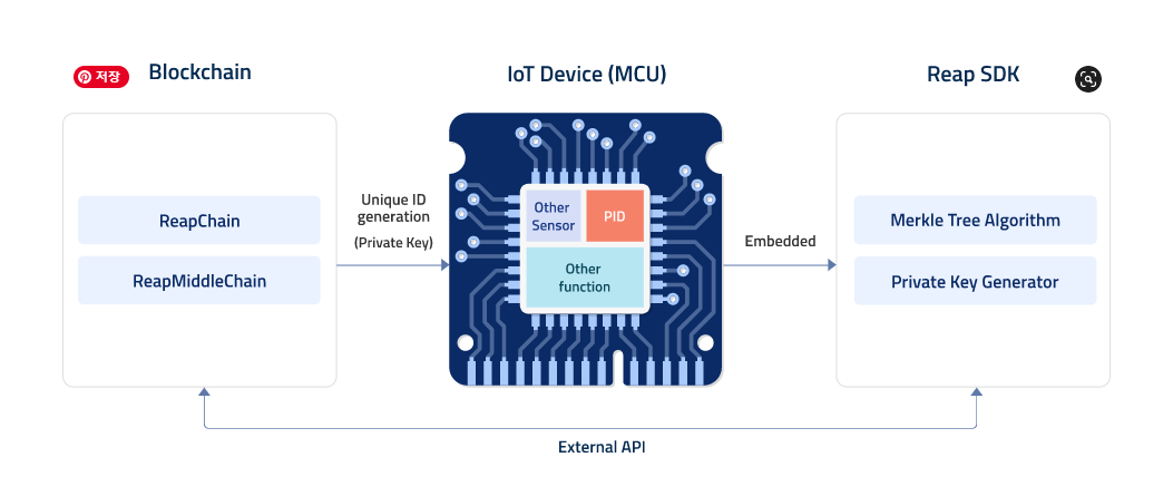 개별 IoT 기기는 데이터 위변조를 방지하기 위해 Reap SDK를 통해 기기별로 고유한 ID인 Private Key를 획득합니다. 개별 IoT 기기는 Reap SDK를 통해 개별 기기의 고유 ID인 Private Key를 획득하여 해킹이나 불법 접근을 방지합니다.