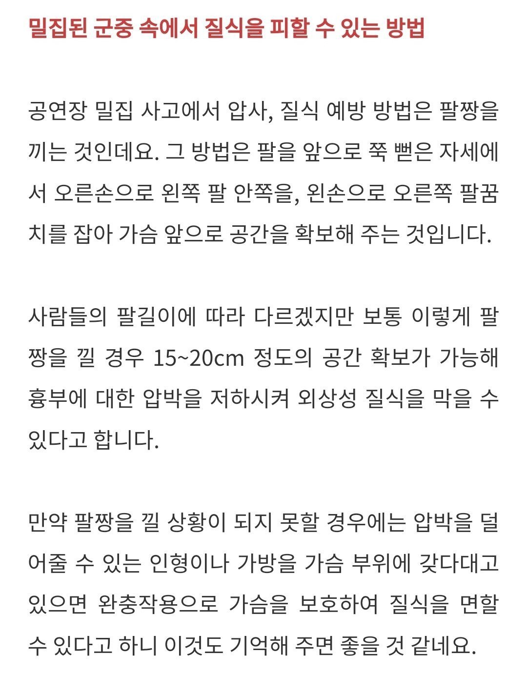 공연장 밀집 사고에서 압사, 질식 예방 방법은 팔짱을 끼는 것인데요. 그 방법은 팔을 앞으로 쭉 뻗은 자세에서 오른손으로 왼쪽 팔 안쪽을, 왼손으로 오른쪽 팔꿈치를 잡아 가슴 앞으로 공간을 확보해 주는 것입니다.