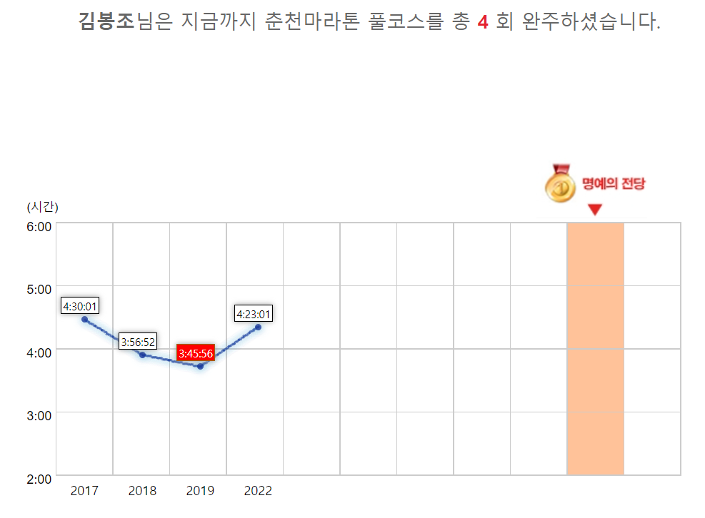 3년 만에 열린 대회에 참가하고 기록을 조회했다. 4번 참가하였다. 열 번을 참가하면 춘천마라톤 명예의 전당에 오르고 크고 반짝이는 크리스털 트로피를 준다. 그 길에 이르는 길은 힘든 건 말할 필요도 없고, 물 한 방울 없이 건조하고 메마른 길이다. 어떤 일에서 의미를 찾는 일을 꼭 어리석다고 할 수는 없지만 의미란 놈도 삶의 이유처럼 찾으면 찾을수록 멀리 숨는 경향이 있다. 좋으면 하는 거고, 하고 싶으니까 하는 거고, 해야만 하니까 하는 거다.