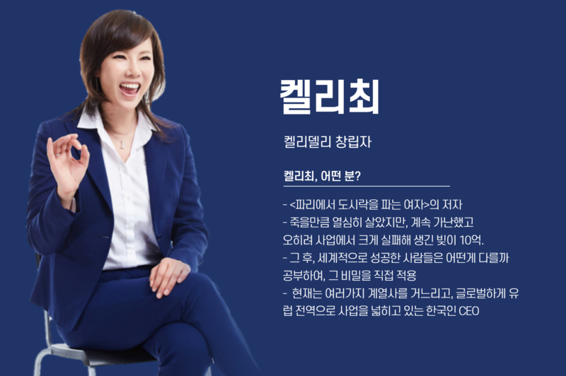 게다가 동시에 켈리델리 사업도 준비 중이어서 몸이 두 개라도 부족할 지경이었습니다. 그리고 따져봤어요. 한 번 술을 마시면 최소 2시간 이상이 소요됐습니다. 그리고 일주일에 세 번이면 6시간이었어요. 이 시간이 저는 정말로 아까웠습니다. 그 뒤로 저는 술을 한 모금도 마시지 않았어요. 제가 잘 따르던 선배 언니는 저를 놀렸습니다. 켈리야 보통 사업을 시작하면 거래처 사람들하고 술 마시고 친분을 쌓기 시작하는데 너는 반대로 술을 끝내 그 배장은 도대체 어디서 나오는 거야 전 인맥에 연연하고 싶지 않았습니다.
