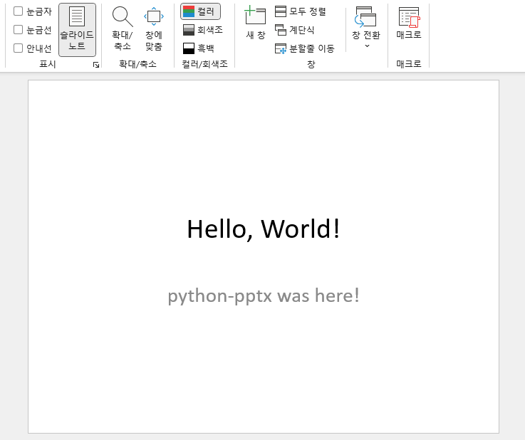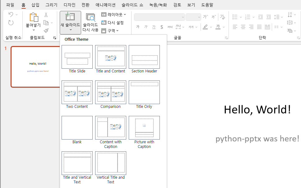 pptx 파일을 열면 아래와 같다. 이제 pptx에 내용을 채워넣는 방법을 알아보자.