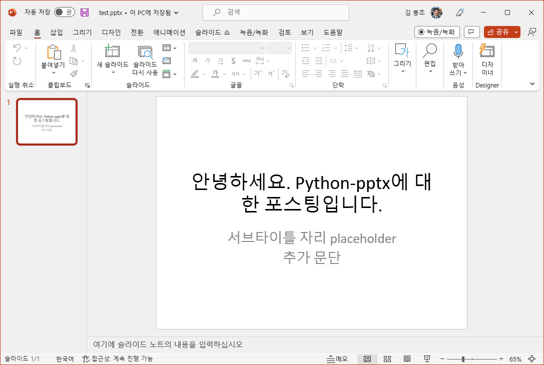 title.text = "안녕하세요. Python-pptx에 대한 포스팅입니다."