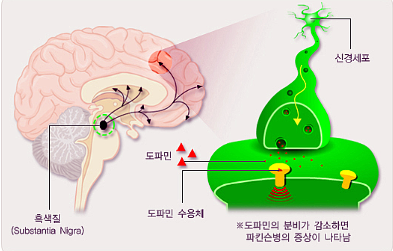 도파민은 카테콜라민(Catecholamine은 부신수질에서 분비되는 신경전달물질이자 호르몬이다. 에피네프린(epinephrine), 노르에피네프린(norepinephrine), 도파민(dopamine) 등이 카테콜아민에 포함되며, 카테콜아민은 교감신경 지배 장기에 작용하여 혈압을 상승시키고, 간에서 글리코겐 분해를 촉진시켜 혈당을 상승시키는 등의 역할을 한다.)중의 하나로 운동기능, 동기부여, 뇌하수체 호르몬 조절 등의 중요한 기능을 하는 신경전달물질로써 파킨슨 증후군, 약물중독, 우울증, 정신분열증 등의 여러 신경 정신 질환에 관여하고 있다.