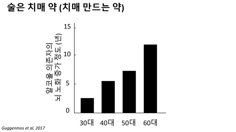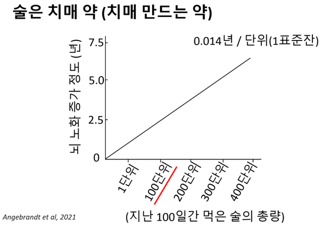 사실, 술은 우리가 합법적으로 접할 수 있는 모든 물질 중 단연 최악의 가속노화 인자다. 술은 마시면 즐겁고(도파민) 가바 GABA가 활성화되어 긴장이 해소되어 오랜 기간 인류의 낙이 되어 왔다. 우리는 좋든 싫든 100세까지 살아야 할 가능성이 높은데, 다들 괜찮다고 생각하는 정도의 음주(한 번에 세 잔 정도)만으로도 치매를 12년 가까이 앞당길 수 있기 때문이다. 조기에 치매가 오면 본인의 삶도 즐겁지 못하게 되는데, 주변 사람들의 불필요한 고통은 이루 말할 수가 없다.