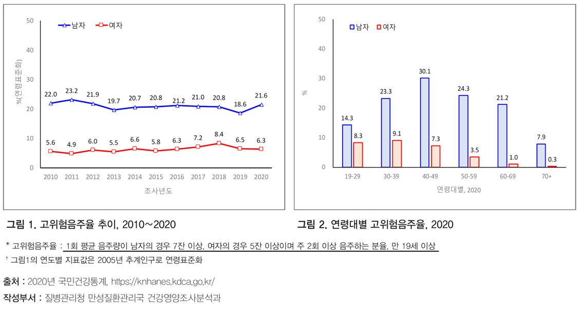 쾌락 적응 법칙 때문에, 술을 좋아하는 보상 회로가 생기면 다른 삶의 낙들은 보상의 크기가 쪼그라들어 버린다. ‘술에서 낙을 찾는다’라고 하는 사람들은 다른 삶의 요소들이 흑백처럼 보인다. 그래서 술을 끊으면 낙이 없을 것으로 두려워하지만, 사실은 삶의 낙을 회복하기 위해서는 술이나 마약 같은 인위적이고 해로운 중독원을 반드시 삶에서 제거해 주어야만 한다. 안타깝게도 그림처럼 현재 우리나라의 30-40대 남자들의 거의 1/3이 스스로의 치매를 12년 앞당기는 음주 습관을 가지고 있다. 동년배 성인 남성들의 미래가 너무 걱정되는 현실이다.
