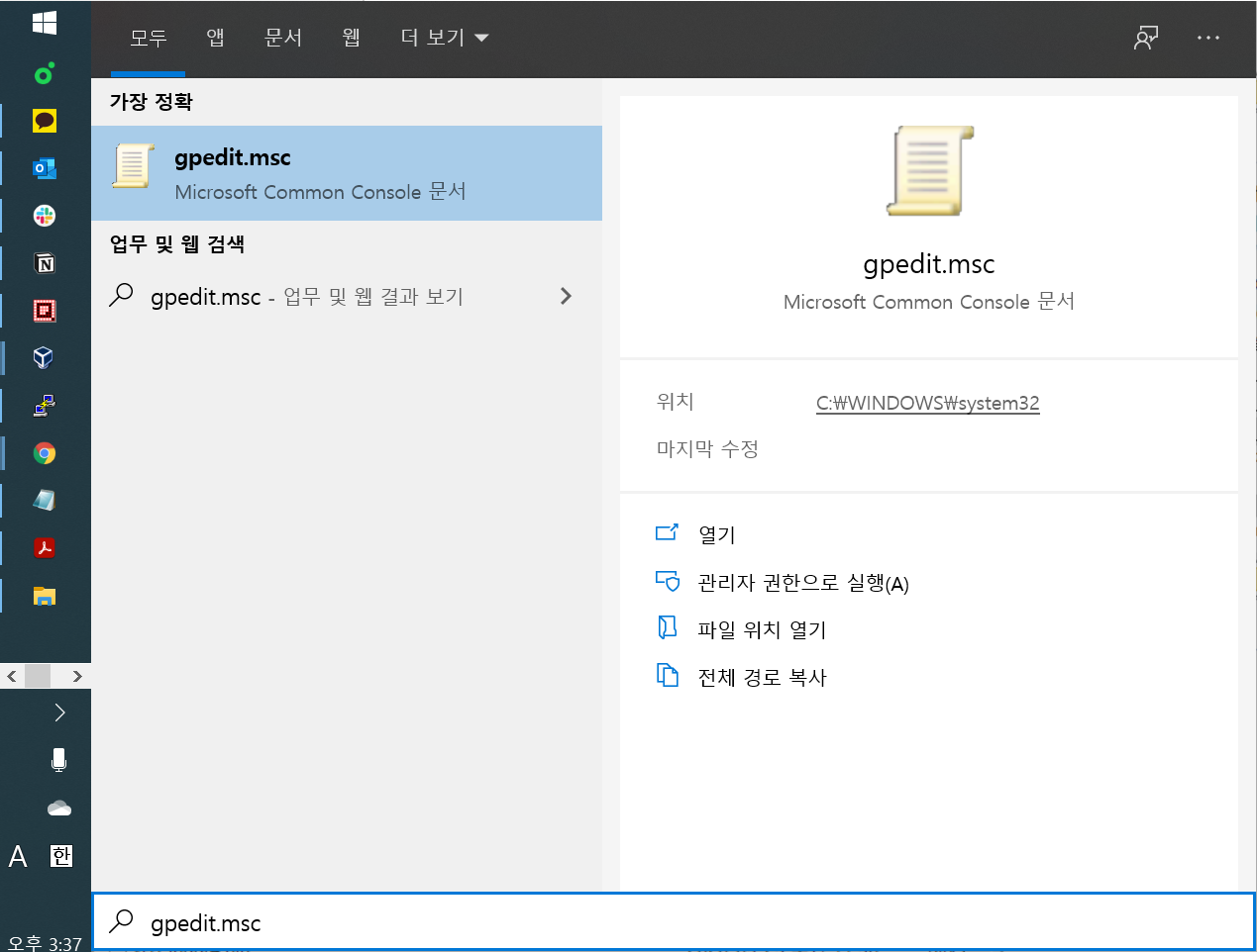 재부팅 메시지가 나오는데 재부팅합니다. 재부팅이 되면 "Windows Key + S" 키를 눌러서 "gpedit.msc"을 실행합니다.