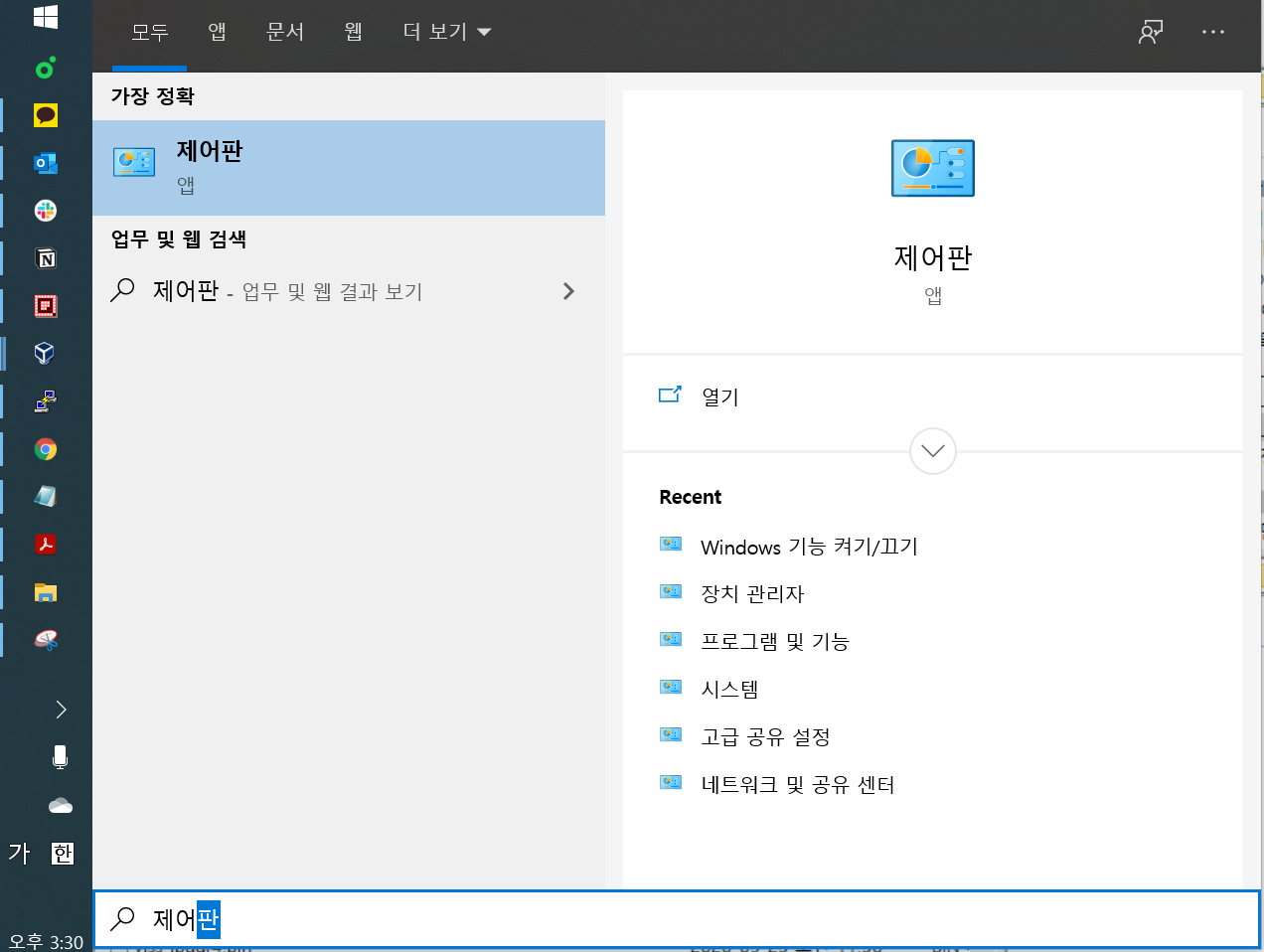 우분투 환경과 윈도우간에 삼바로 네트워크 연결을 하려 할 때, 윈도우 10에서 SAMBA가 연결이 안 될 때가 있습니다. 이때 윈도우 10의 환경을 설정해줘야 합니다. 먼저 "Windows Key + S" 키를 눌러서 제어판을 실행합니다.