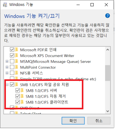 Windows 기능 창이 뜨면 중간에 "SMB 1.0/CIFS 파일 공유 지원" 항목이 있습니다. 모두 체크하고 확인 버튼을 클릭합니다. 여기까지 잘 설정이 되어 있다면 부팅 할 필요없이 다음 단계로 갑니다.